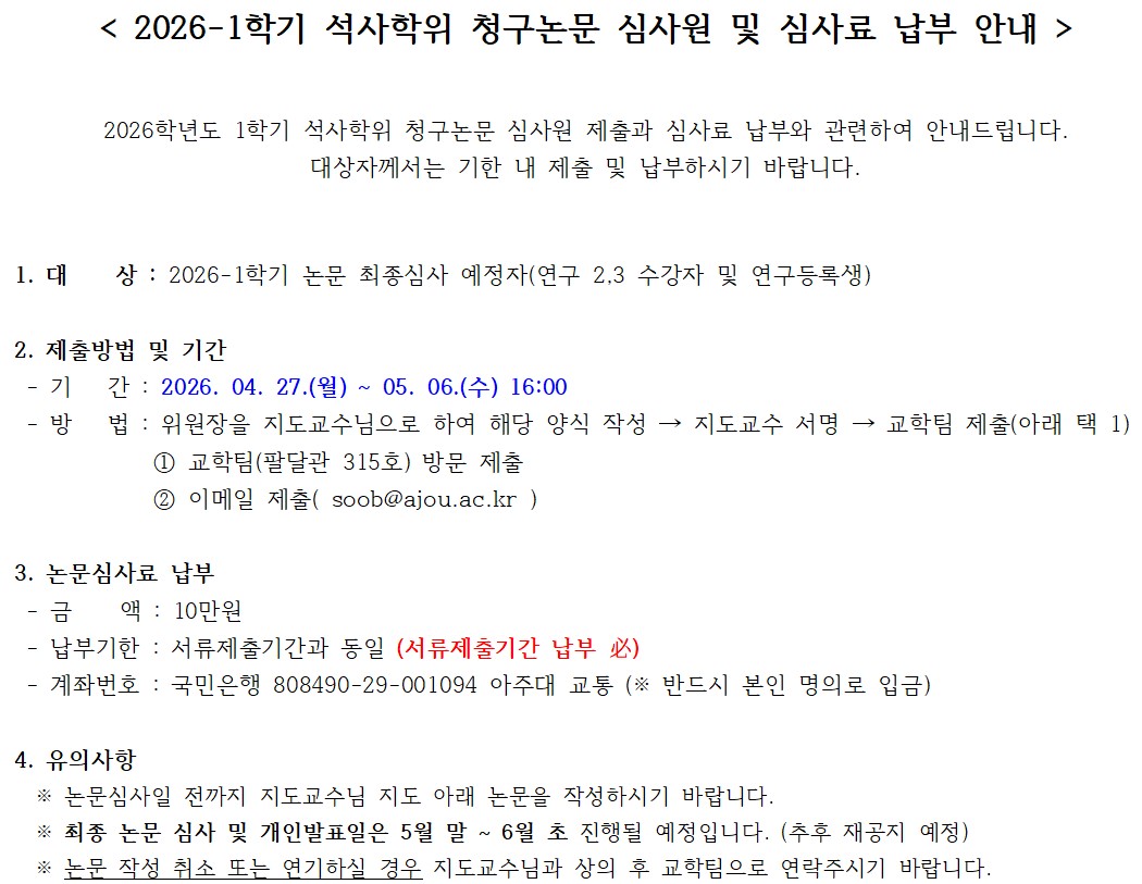 [공지] 2026-1학기 석사학위 청구논문 심사원 제출 및 심사료 납부 안내