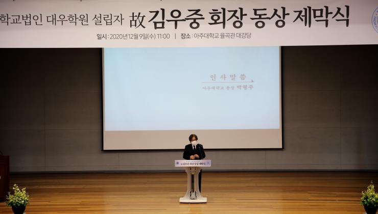 동상 제막식은 9일 오전 유가족과 대우그룹, 대우학원, 아주대학교와 아주대학교병원 관계자들이 참석한 가운데 진행됐다.