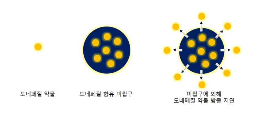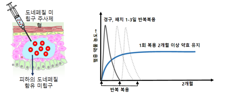 치매 환자의 약물 복용 편의성을 높이기 위해 연구팀은 새로운 접근 방식을 택했다. 도네페질 약물을 마이크로사이즈의 미립구에 포함된 형태로 제조하고, 주사 주입 시 생분해성 하이드로겔과 함께 투입했다. 이를 통해 미립구 내의 약물이 미립구에서 하이드로젤로 방출되고, 그 후 혈중으로 투입될 수 있도록 했다. 도네페질 약물이 미립구 내에 포함된 형태로 제조되면 1차적으로 약물의 방출이 지연되며, 이후 도네페질 약물이 하이드로젤로 방출됨에 따라 2차 방출 지연이 일어난다. 이를 통해 혈액 중 약물이 장기간 유지되도록 조절할 수 있다.