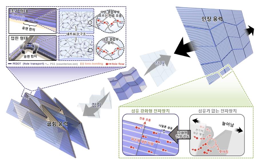 유연한 고분자 전극 소자(PEDOT:PSS)에 나일론 섬유를 내장하여 여러 번 접고, 당겨도 높은 내구성을 유지하는 오리가미 전자장치의 개략도.