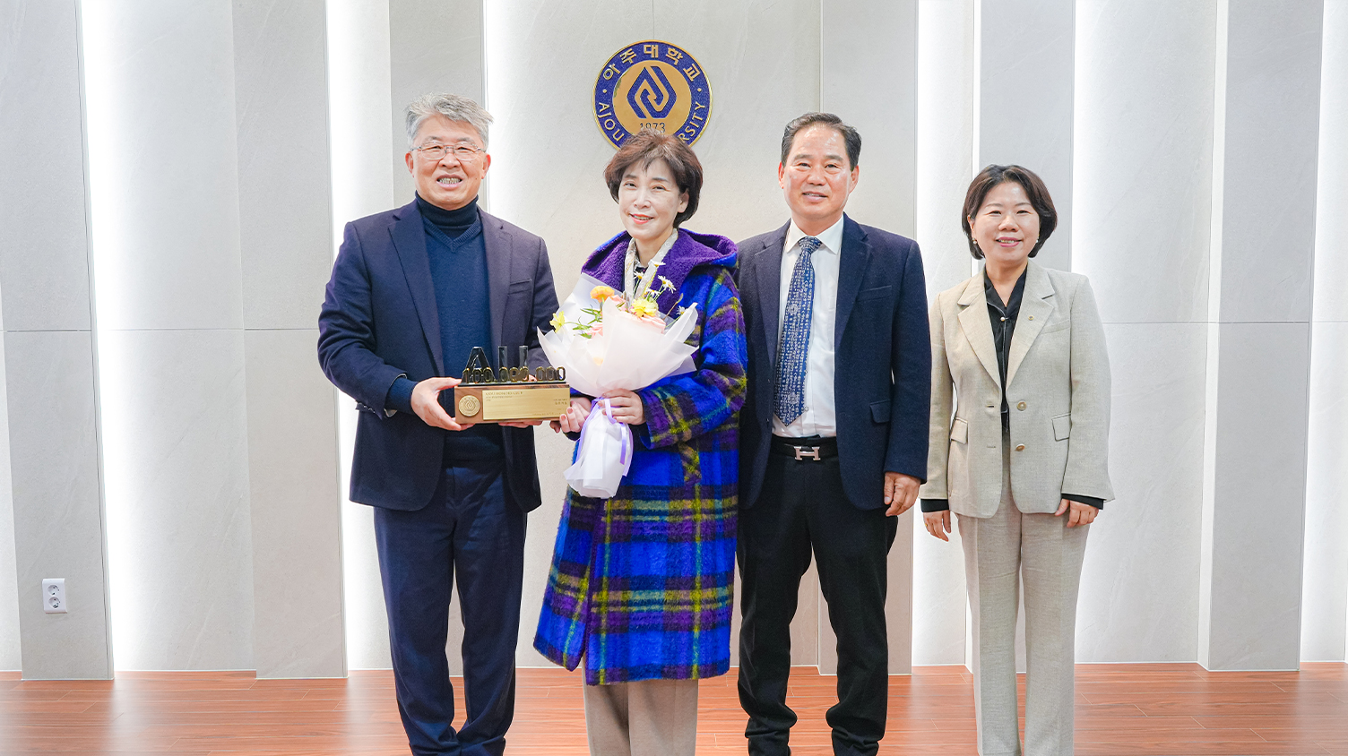 지난 26일 율곡관 총장실에서 열린 기부금 전달식에는 김은아 기부자와 배우자인 이삼구 ㈜해동산전 대표가 참석했다. 학교에서는 최기주 총장과 조경숙 대학발전본부장이 자리했다. 최기주 총장이 아주 가족을 대표해 감사 인사를 전하고 기부자 예우품을 전달했다.