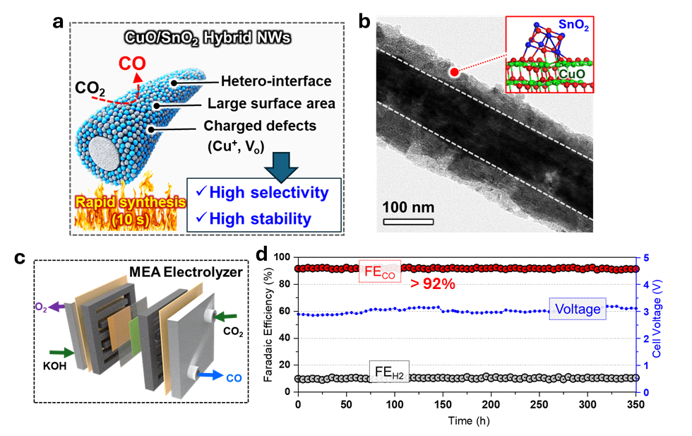 연구 결과는 ‘고선택성 전기화학적 이산화탄소 환원을 위한 맞춤형 이종계면 및 결함이 풍부한 CuO/SnO2 하이브리드 나노와이어 전기촉매(Defect-rich CuO/SnO2 hybrid nanowires with tailored heterointerfaces for selective electrochemical CO2 reduction)’라는 논문으로 에너지·촉매·환경 분야 저명 국제 학술지 <어플라이드 캐탈리시스 B: 환경과 에너지(Applied Catalysis B: Environment and Energy)> 4월호에 게재됐다.