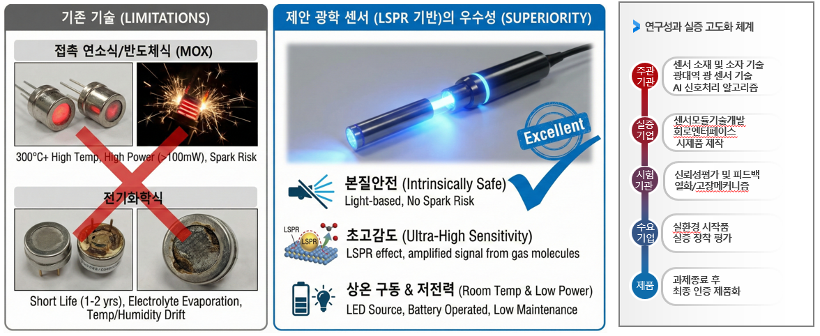 서형탁 교수팀은 이번 사업 선정을 기반으로 미래 에너지 3대 핵심 가스인 수소(H2), 암모니아(NH3), 메탄(CH4)의 미세 누출을 조기에 감지하는 ‘국소 표면 플라즈몬 공명(LSPR) 기반 듀얼모드 다중 센서 및 지능형 엣지 AI 플랫폼’ 원천기술의 고도화에 나선다.