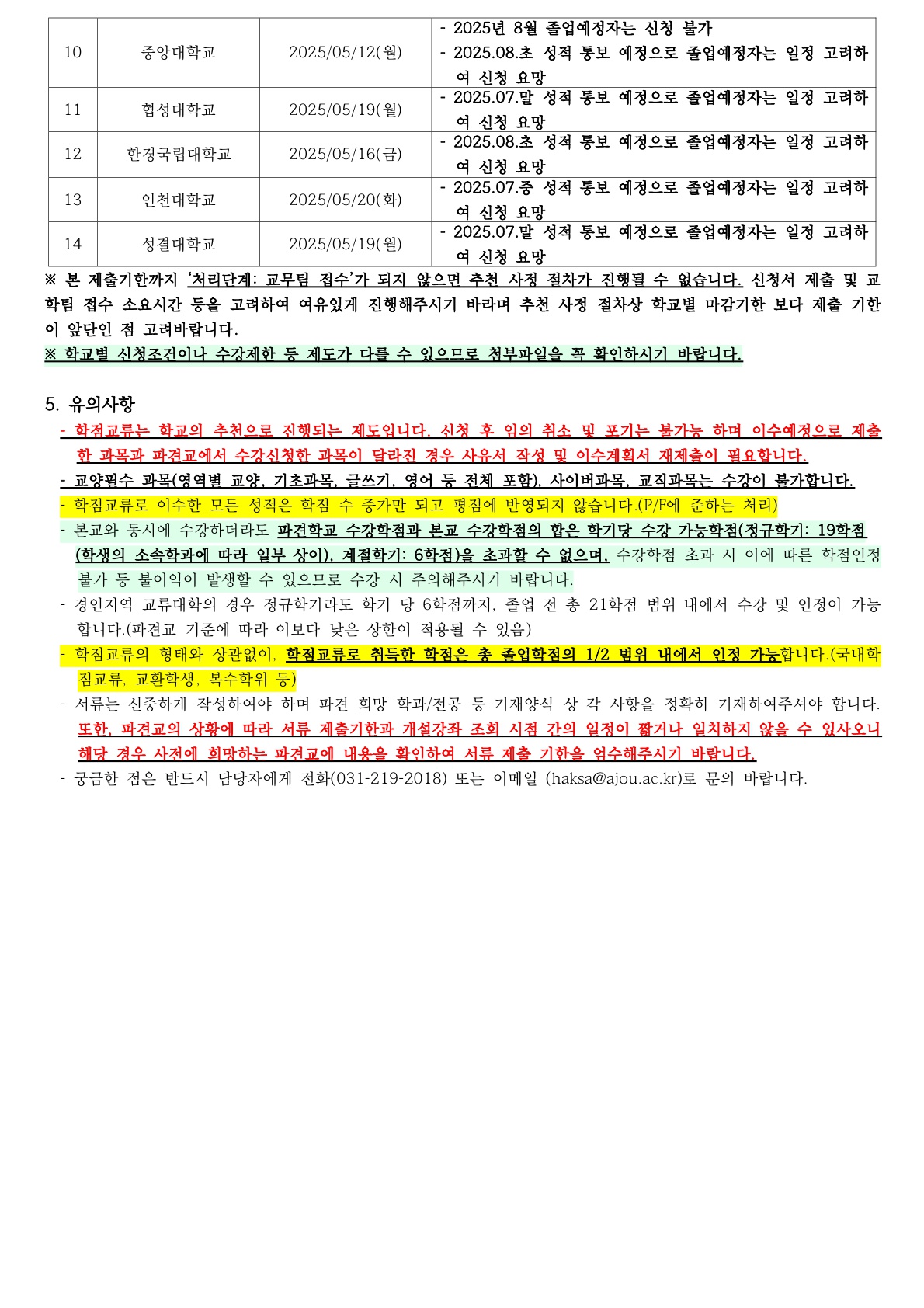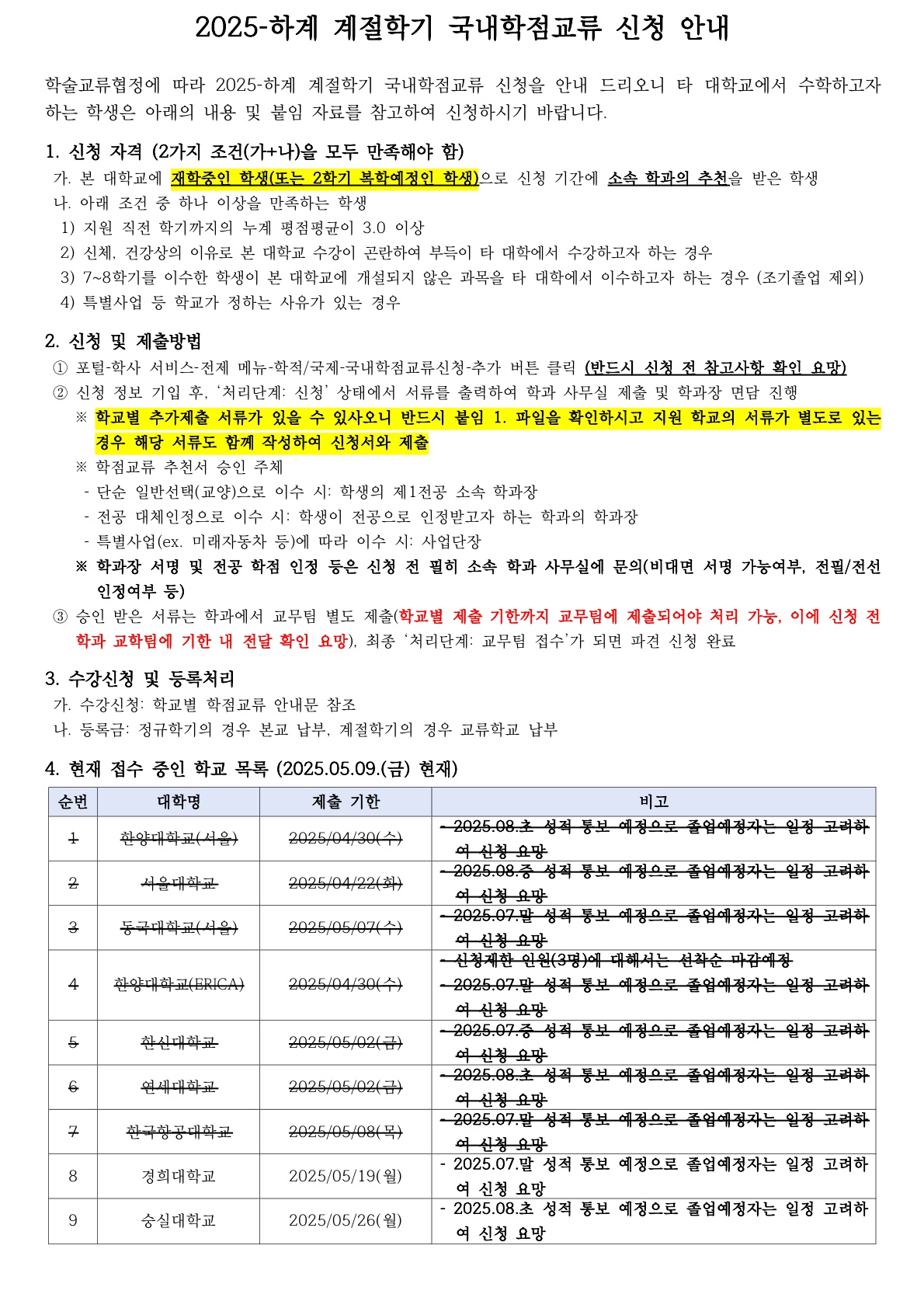 [학사] [학부/학사과정] (25.05.09.) 2025-하계 계절학기 국내대학 학점교류 신청 안내