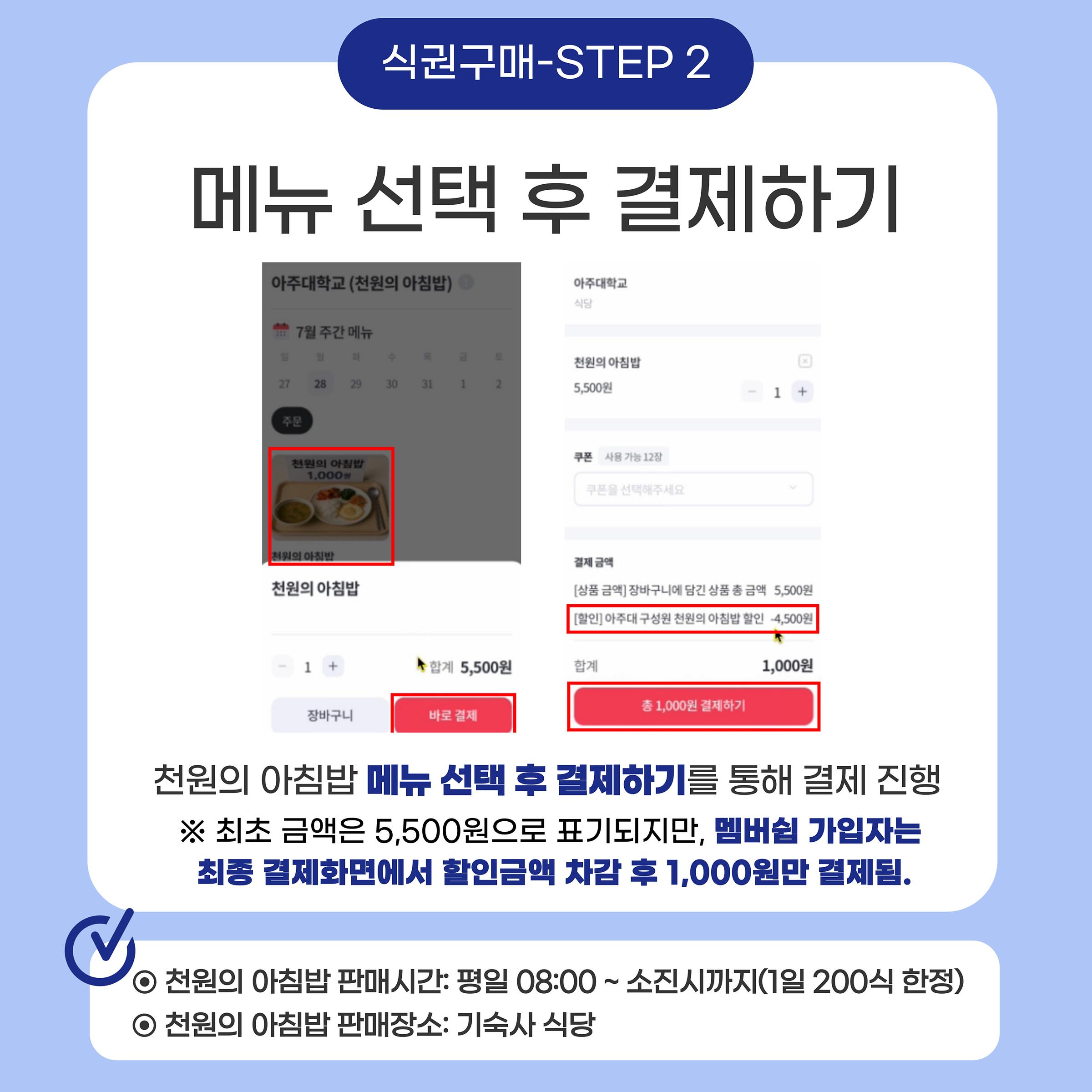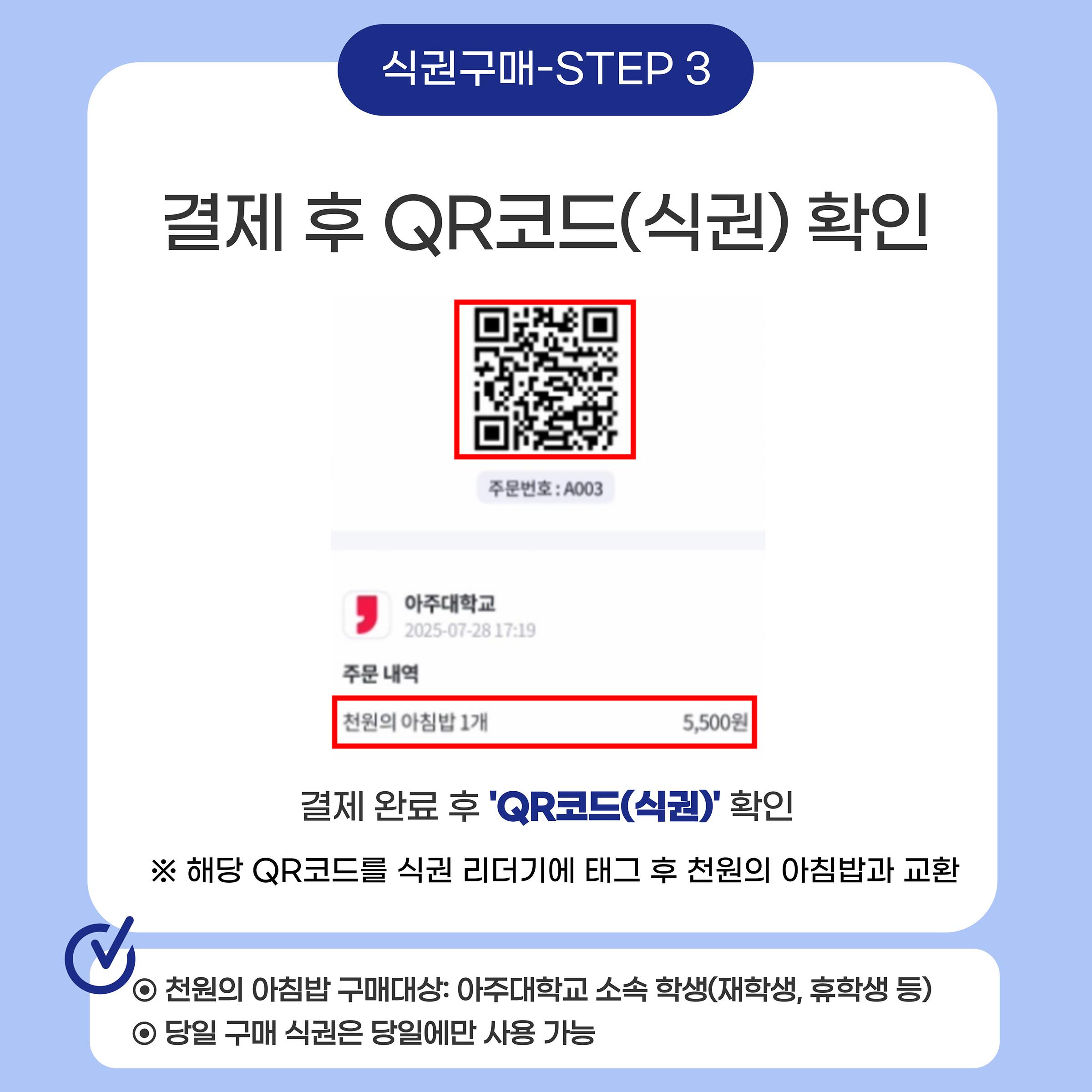 2025학년도 2학기(9월 1일)부터 학생여러분들의 편리하고 원활한 이용을 위해 천원의 아침밥 이용방법이 아래와 같이 변경됩니다.