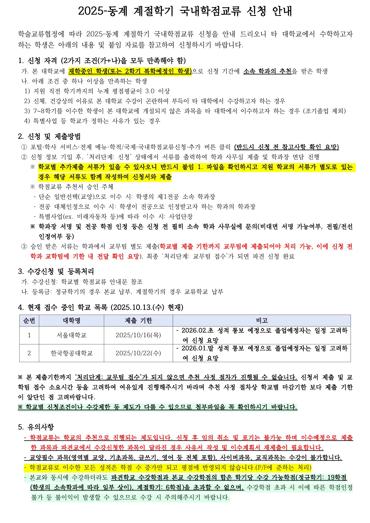 [학사] [학부/학사과정] (25.10.13.) 2025-동계 계절학기 국내대학 학점교류 신청 안내