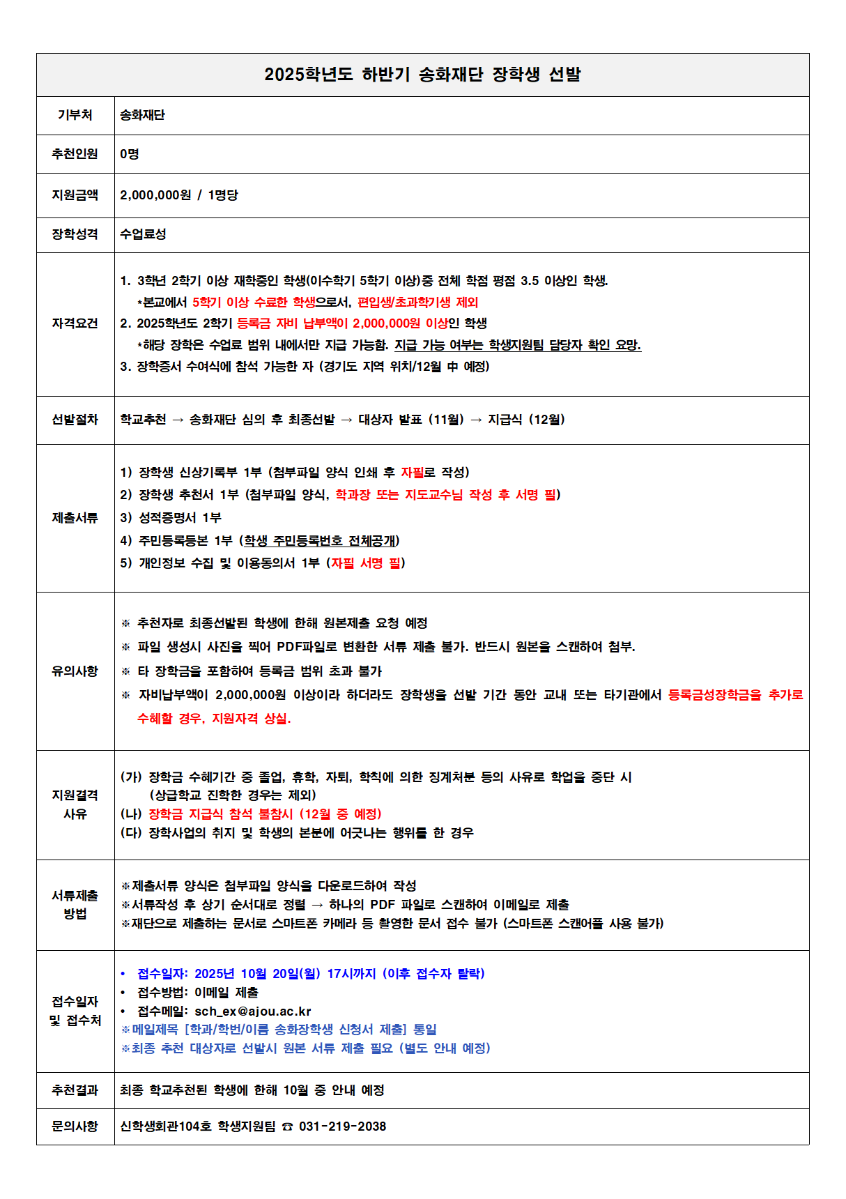 [장학] [교외장학] 2025학년도 하반기 송화재단 장학생 선발 (~10.20.(월) 17시까지)