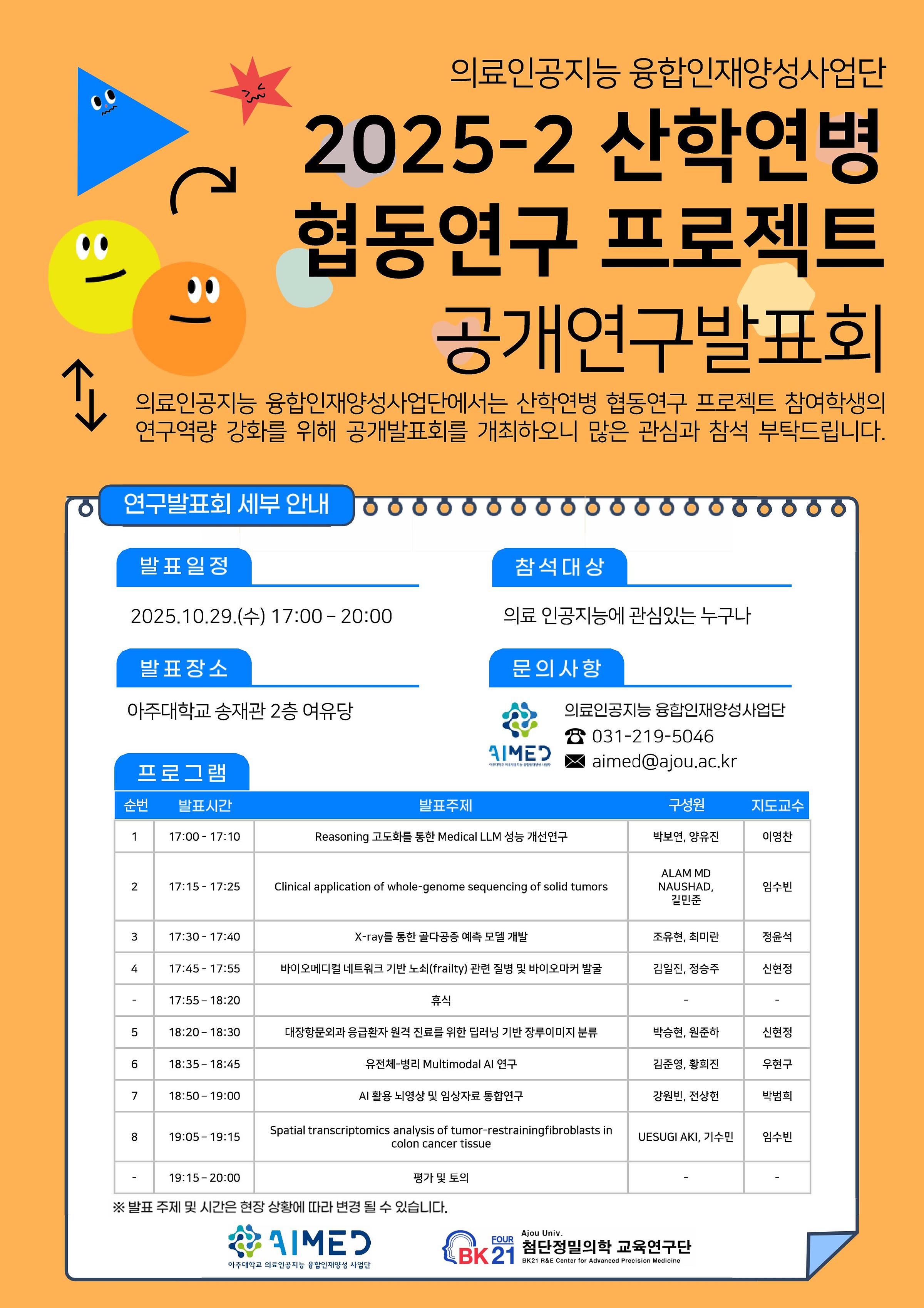 [학사] [의료인공지능] 2025-2 산학연병 협동연구 프로젝트 공개연구발표회 개최 안내(10.29.(수) 오후 5시)
