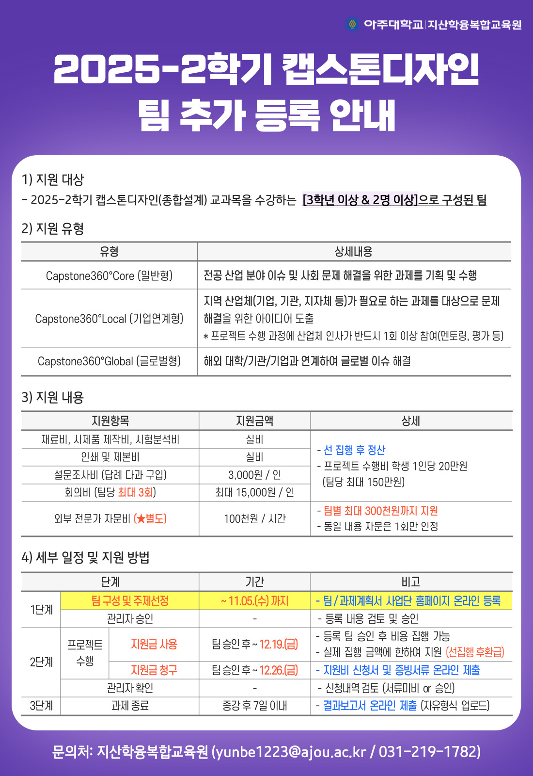 [학사] 2025-2학기 캡스톤디자인 교과목 프로젝트 수행비 지원(팀 추가 등록) 안내
