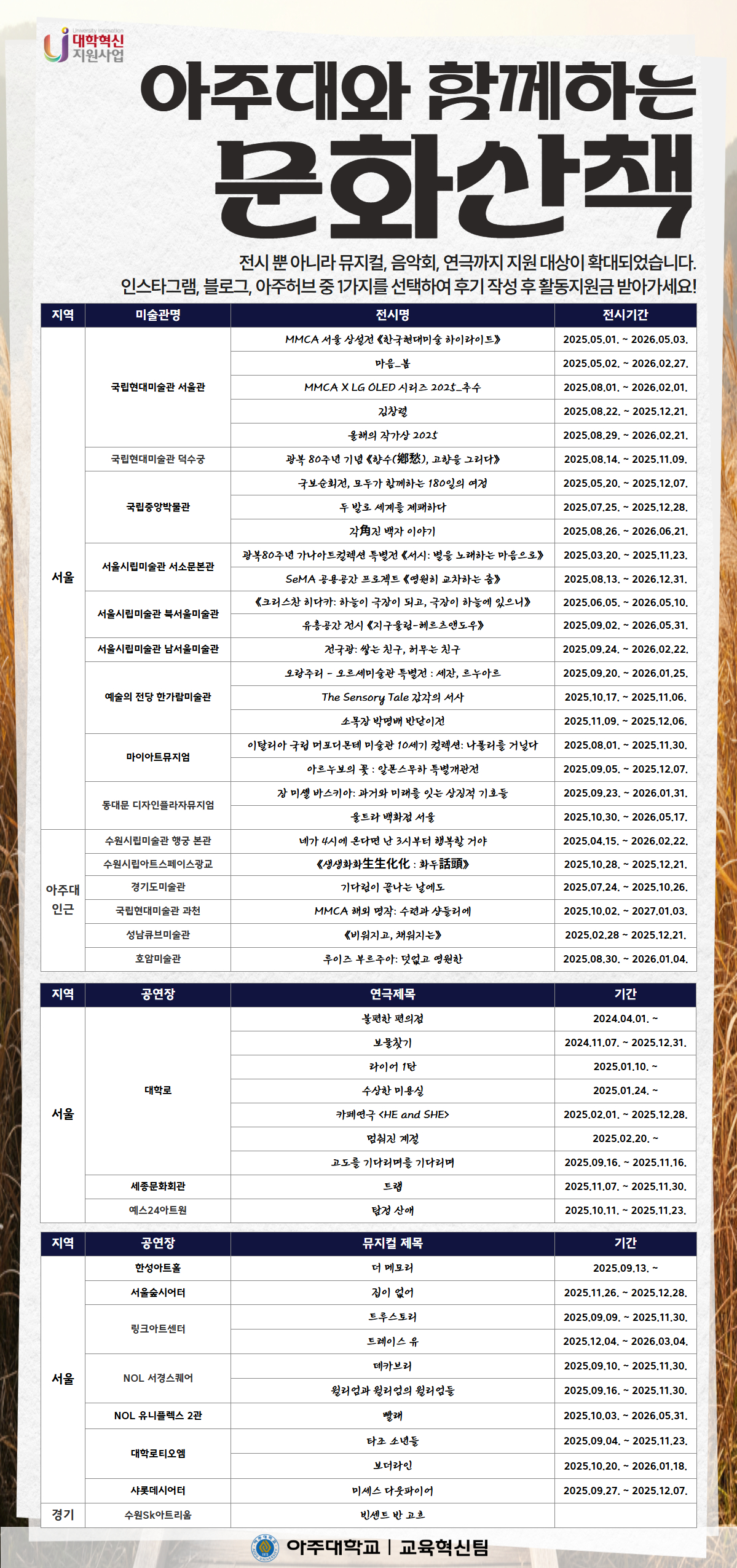 2025ํ•™๋…„๋„๋ถ€ํ„ฐ ์ „์‹œ ๋ฟ ์•„๋‹ˆ๋ผ ๋ฎค์ง€์ปฌ, ์Œ์•…ํšŒ, ์—ฐ๊ทน๊นŒ์ง€ ์ง€์›๋Œ€์ƒ์ด ํ™•๋Œ€๋˜์—ˆ์Šต๋‹ˆ๋‹ค.!