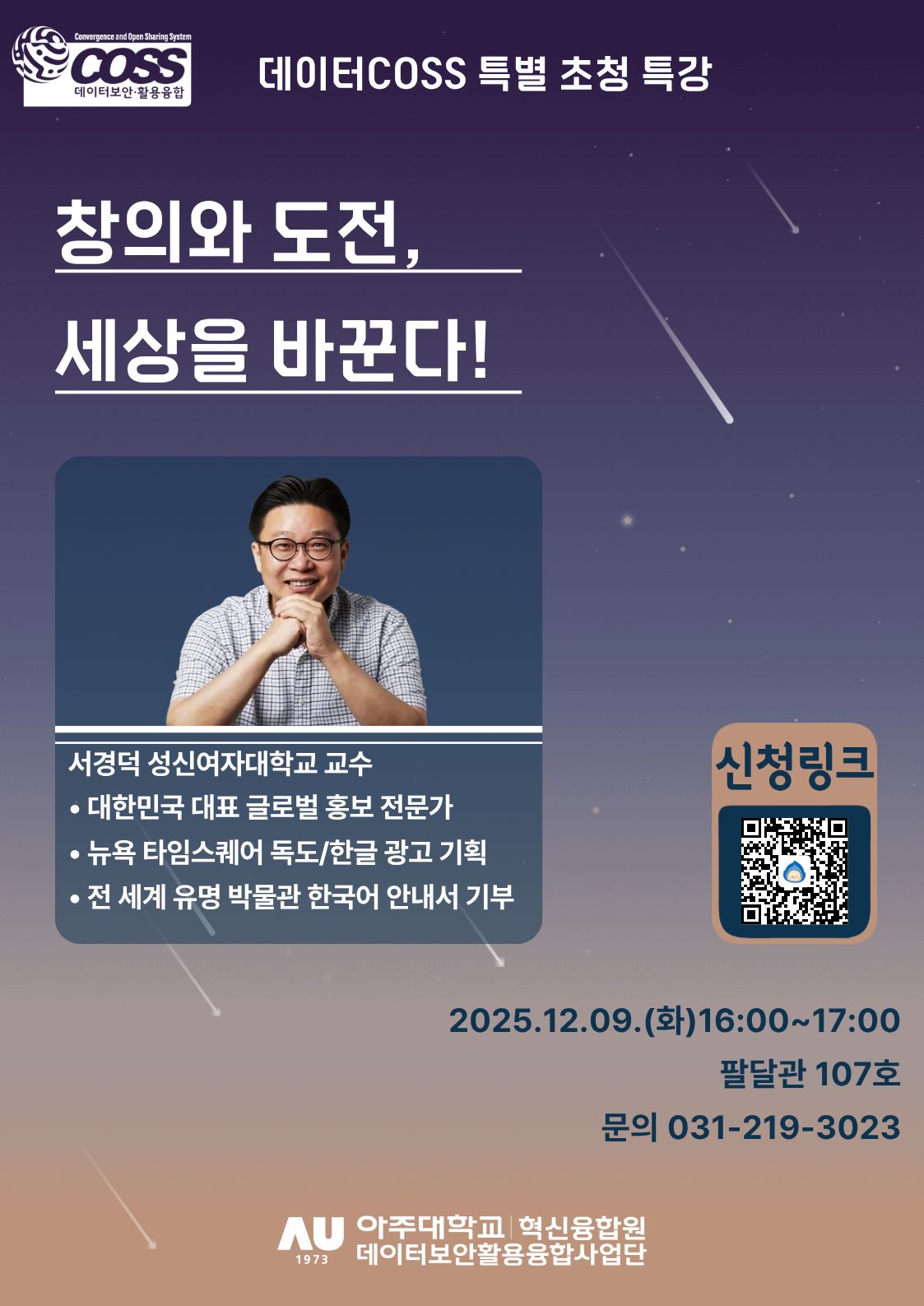 데이터보안·활용융합 혁신융합대학사업단에서 혁신적인 아이디어와 과감한 도전을 통해 K-Culture를 전 세계에 각인시킨 성신여자대학교 서경덕 교수님을 초청했습니다.