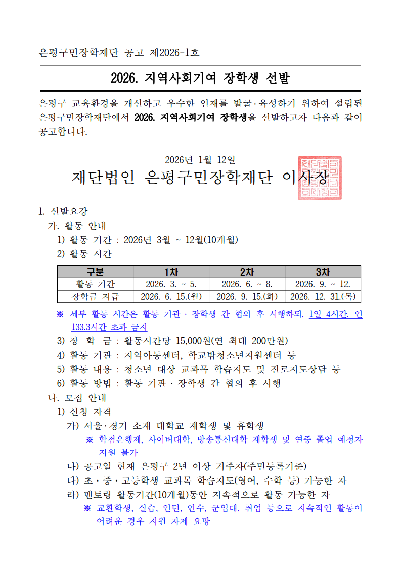 [장학] [교외장학] 2026 은평구 지역사회기여 장학생 선발