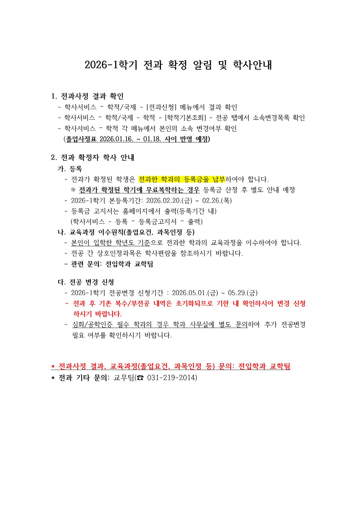 [공지] [학부] 2026-1학기 전과 확정 알림 및 학사안내