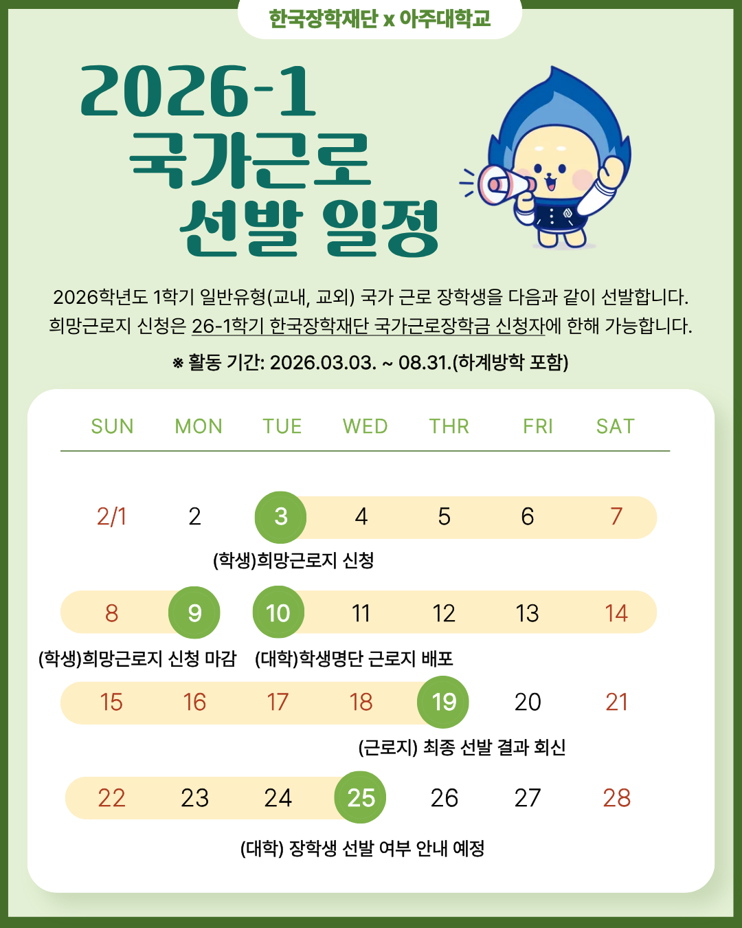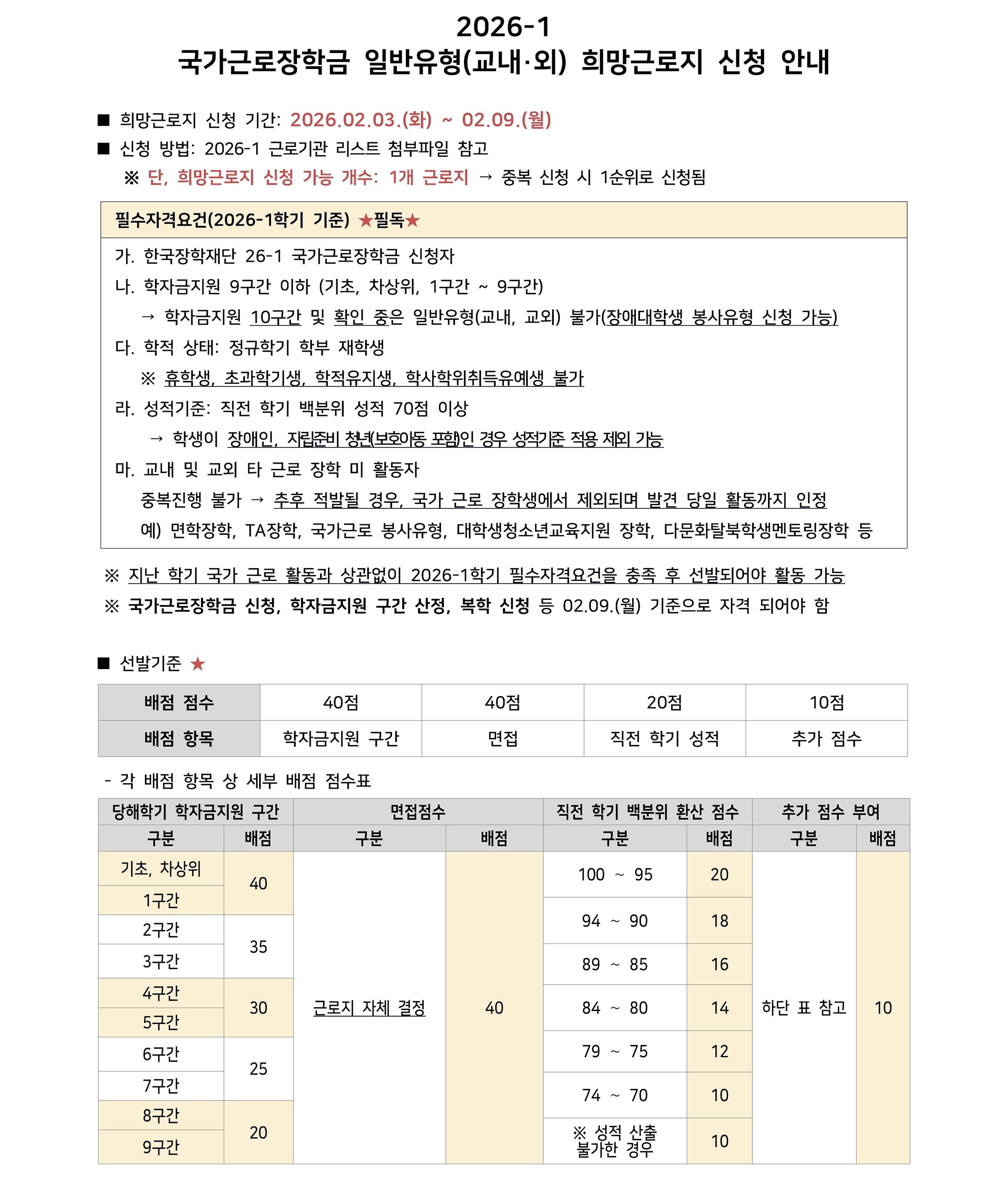 [장학] 2026-1 국가근로장학 일반유형(교내,교외) 희망근로지 신청 안내