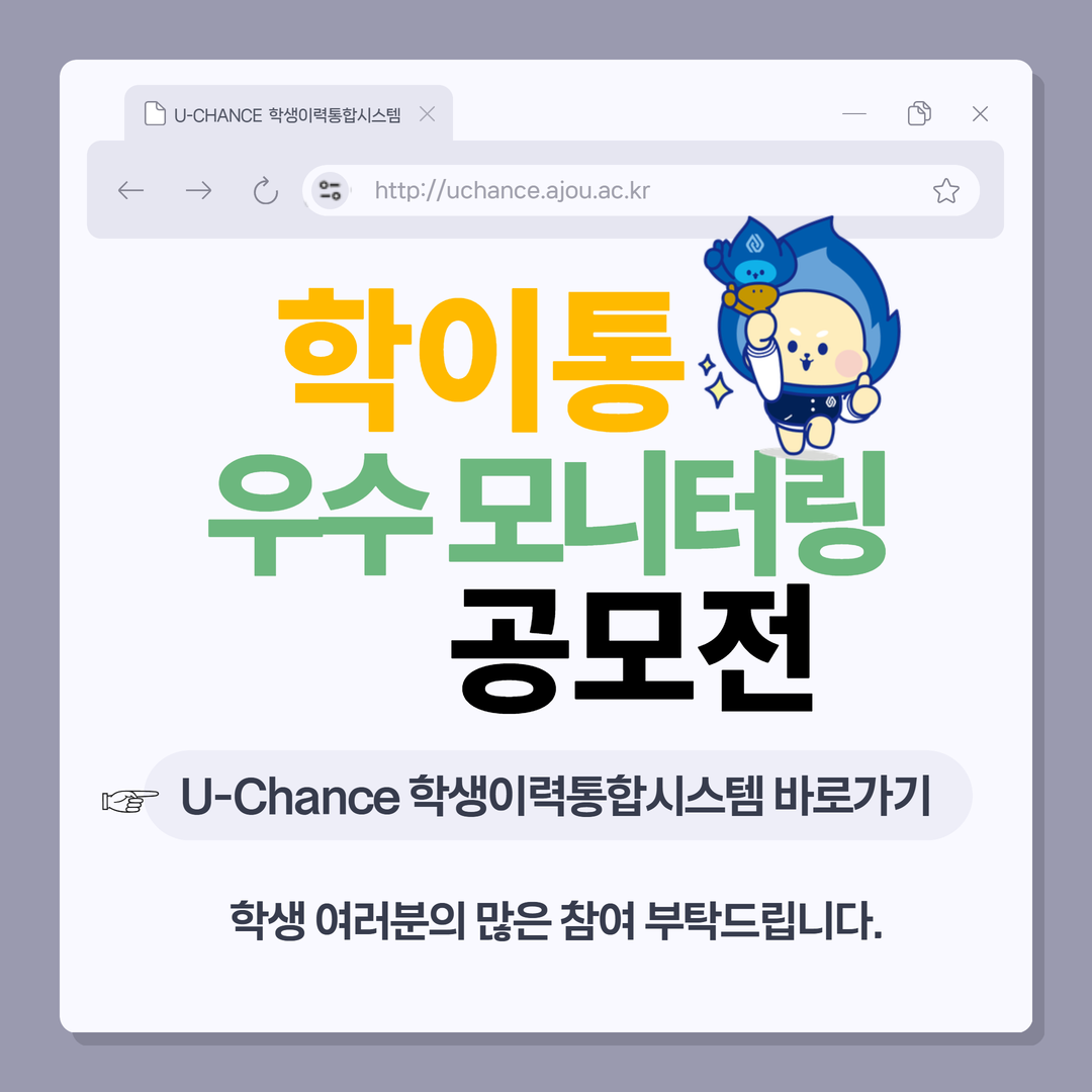 U-Chance ํ์์ด๋ ฅํตํฉ์์คํ ๋ฐ๋ก๊ฐ๊ธฐ : ์์ฃผ๋ํ๊ต ์ญ๋๊ด๋ฆฌ์์คํ