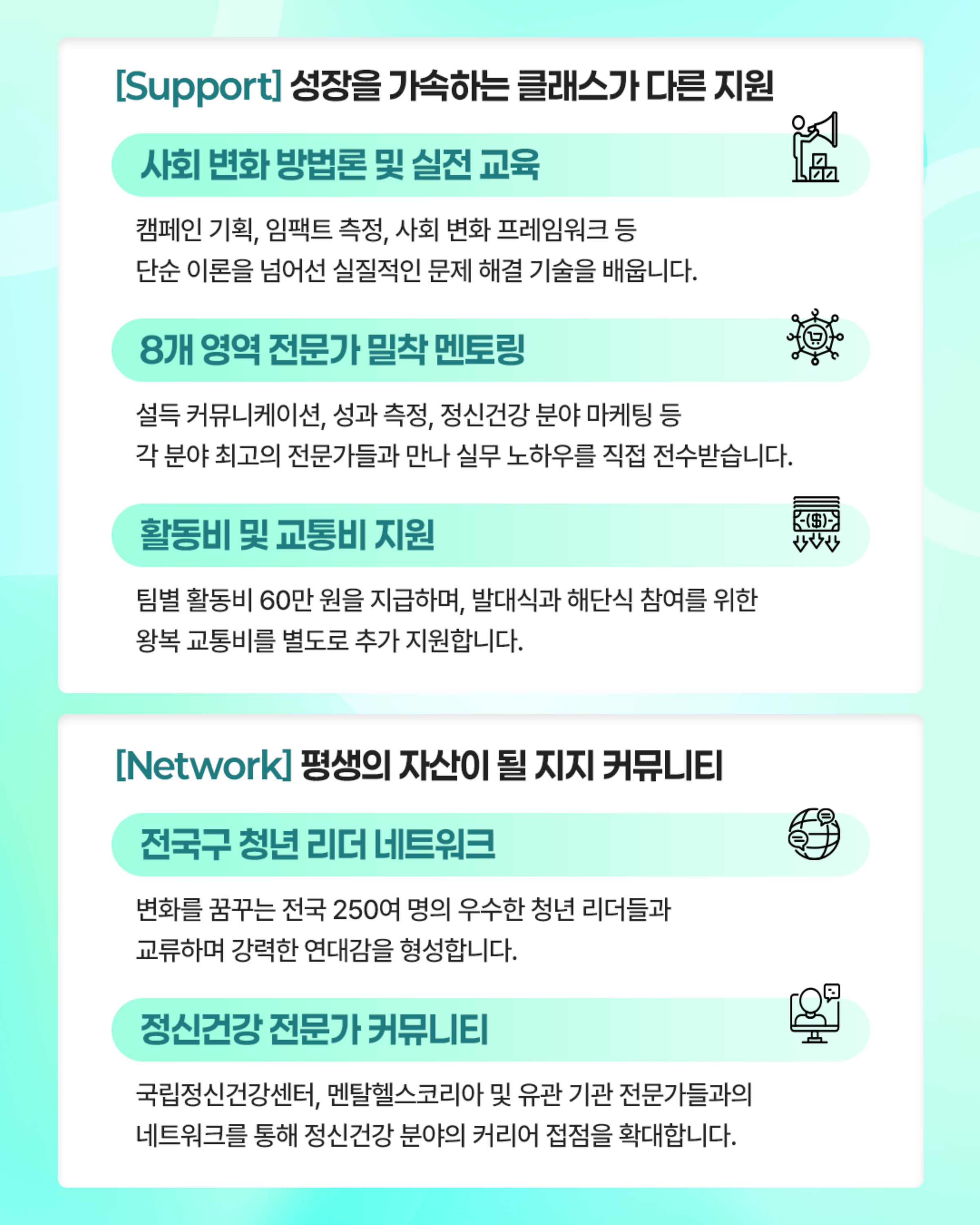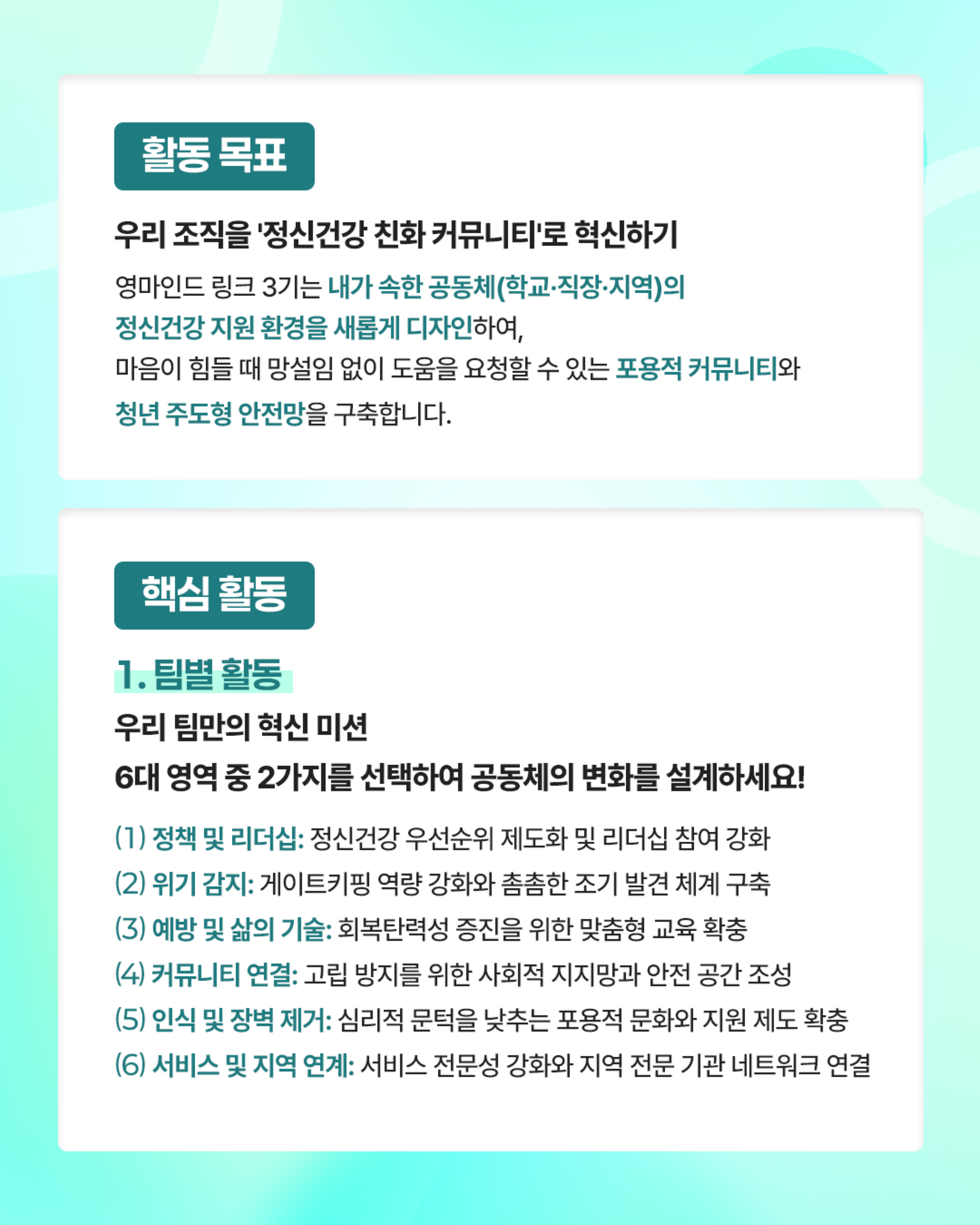 영마인드 링크(Link)는 단편적인 서포터즈 역할이 아닌 정신건강 리더로서 자신이 속한 공동체(학교, 조직 등)의 정신건강 문제를 직접 찾고 해결의 주체가 되는 서포터즈 활동입니다. 정신건강 관련 전공이나 경험이 없더라도, 함께 배우고 성장하고자하는 열정 단원을 모집합니다.