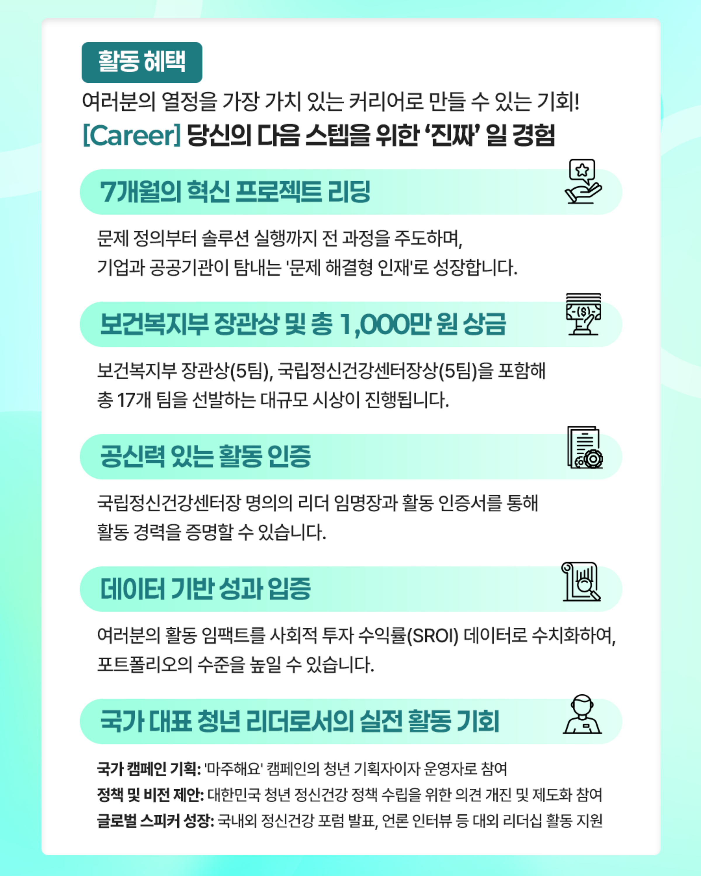 주요활동  국가 정신건강 인식개선 브랜드 '마주해요' 확산 활동 등