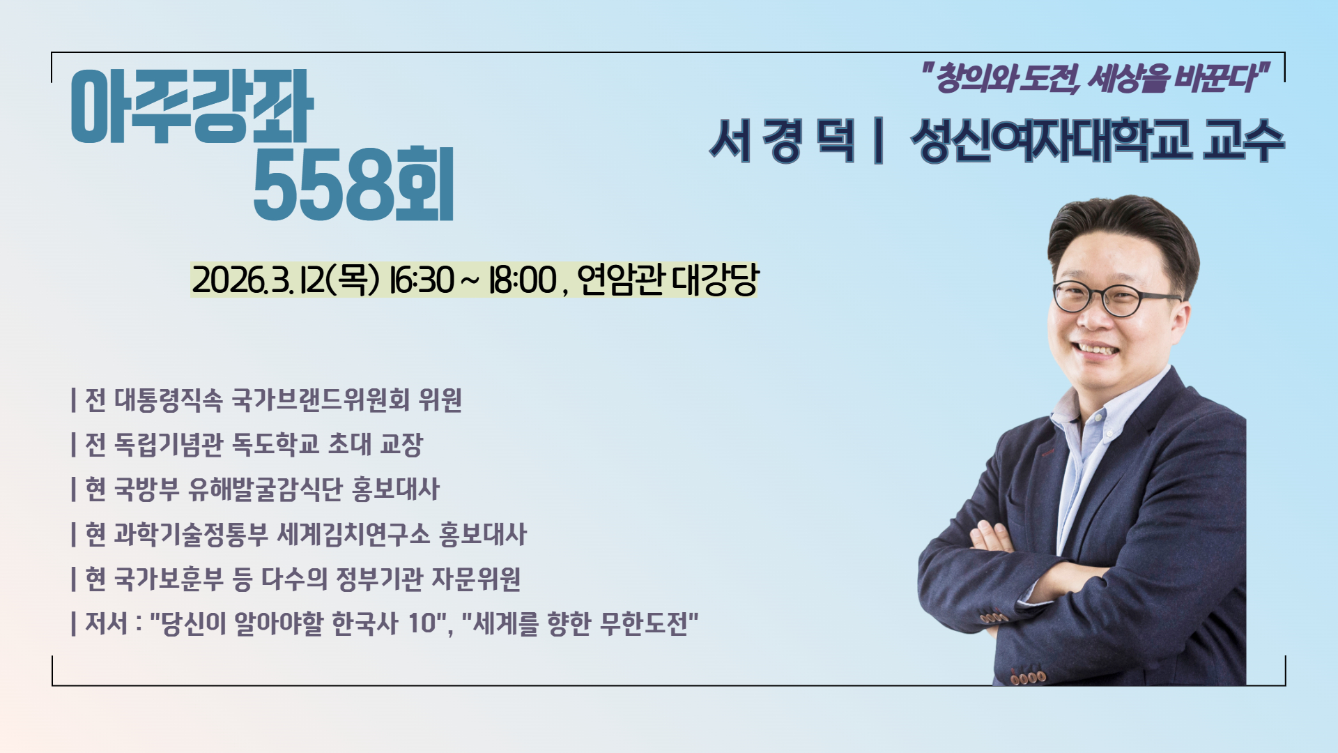 다산학부대학에서는 매주 목요일, 교내외 저명한 인사들을 초청하여 아주강좌를 진행하고 있습니다.