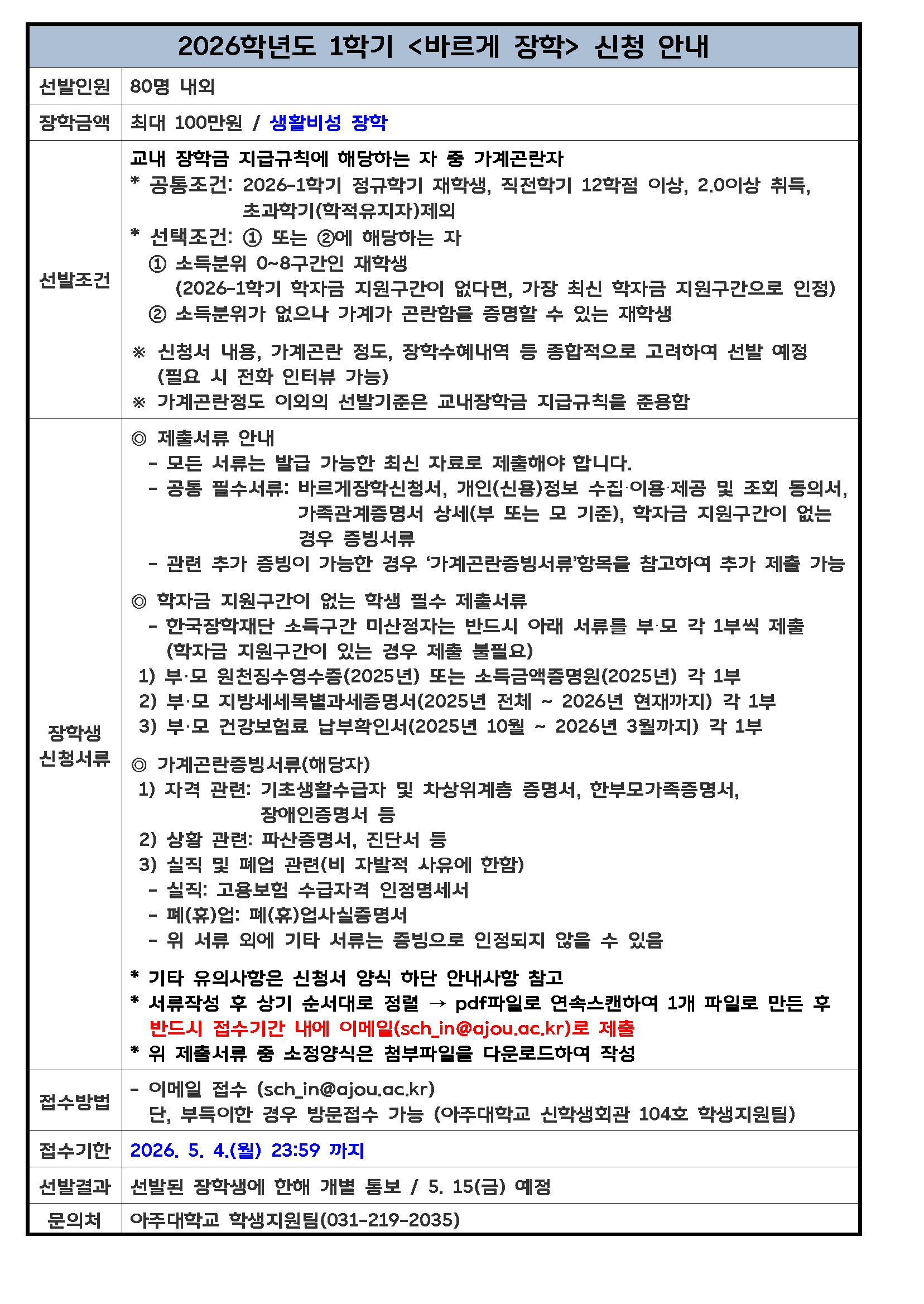 [장학] 2026학년도 1학기 바르게장학 신청안내_5월4일(월)까지