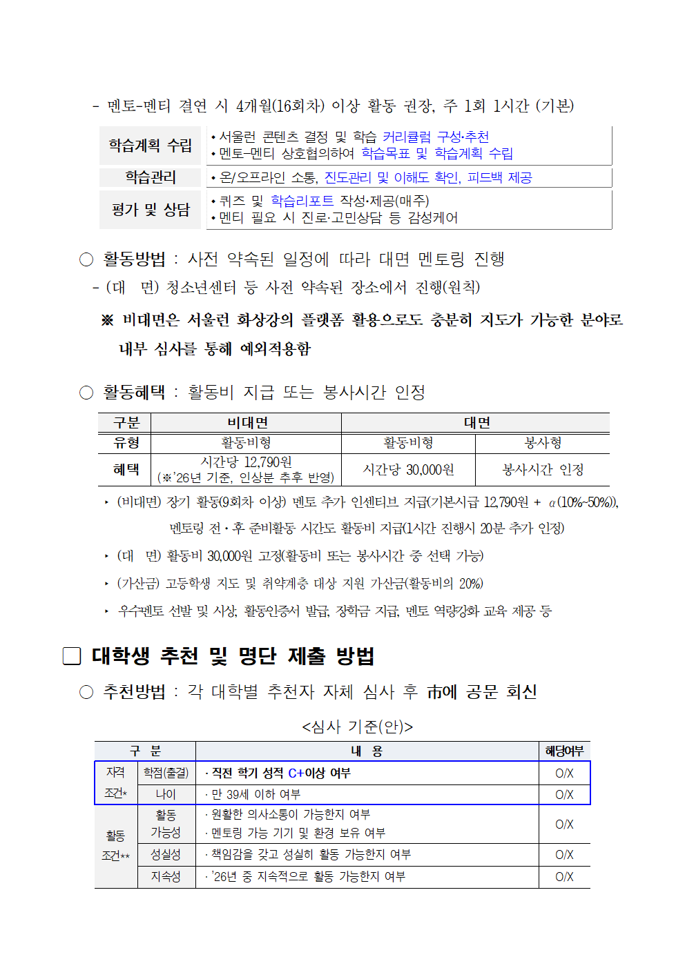 * 해당 멘토링 지원금은 장학이 아니며, 제세공과금을 제외하고 지급됨을 안내드립니다.