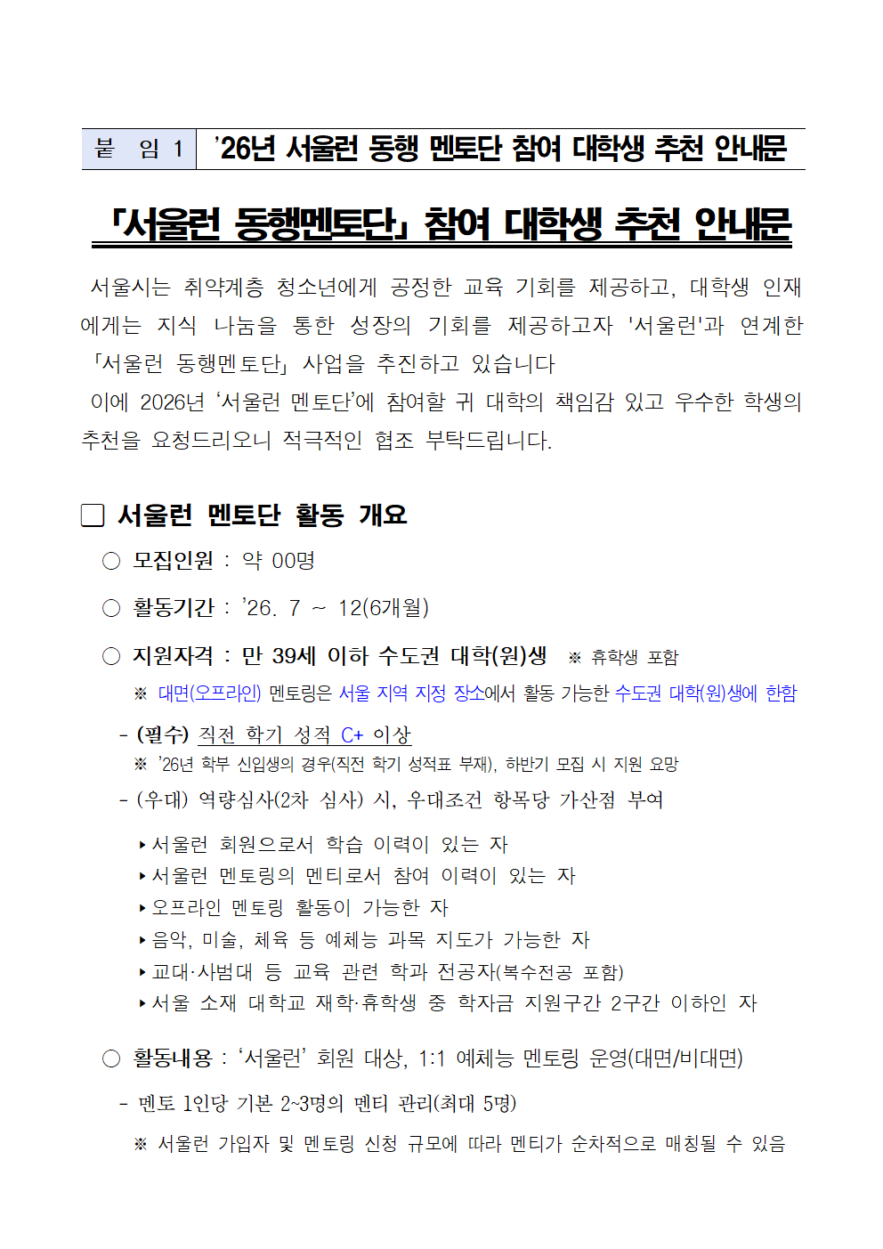 [장학] [교외장학] 2026년 하반기 활동 서울런 동행멘토단 참여 대학생 모집 (~04.27.(월)까지)