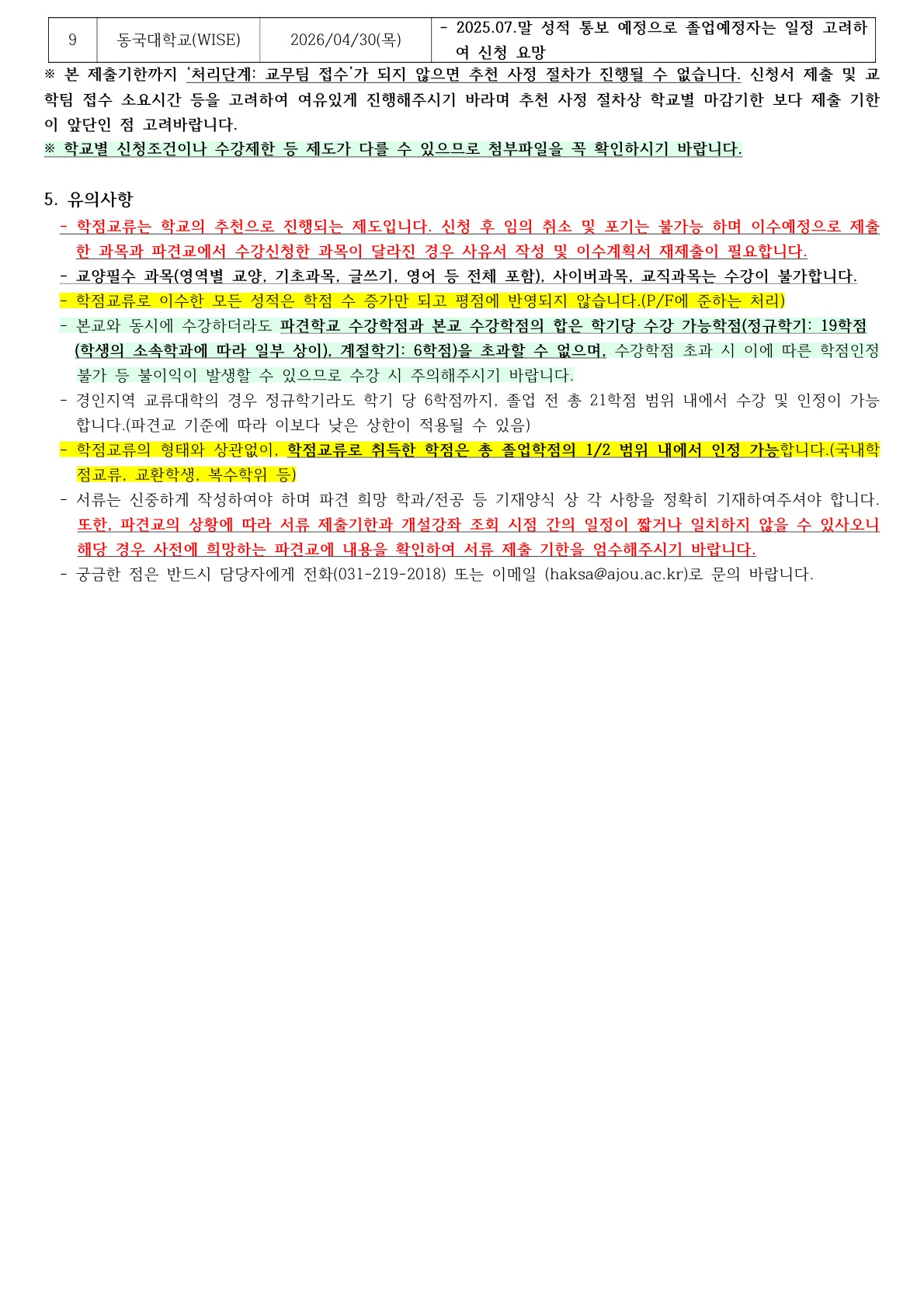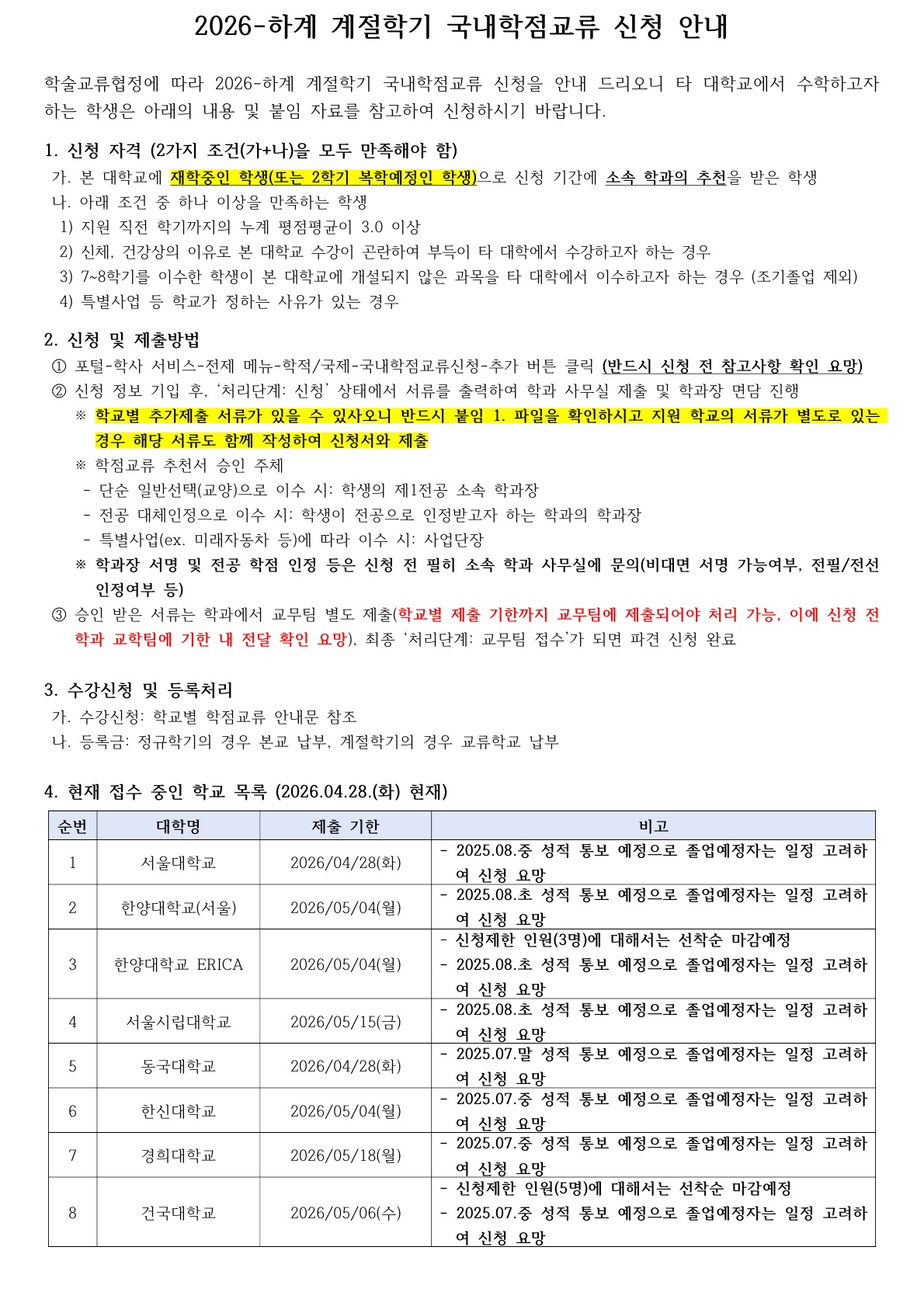[학사] [학부/학사과정] (26.04.28.) 2026-하계 계절학기 국내대학 학점교류 신청 안내