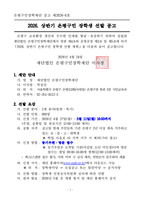 [장학] [교외장학] 2026학년도 상반기 은평구민 장학생 선발 공고