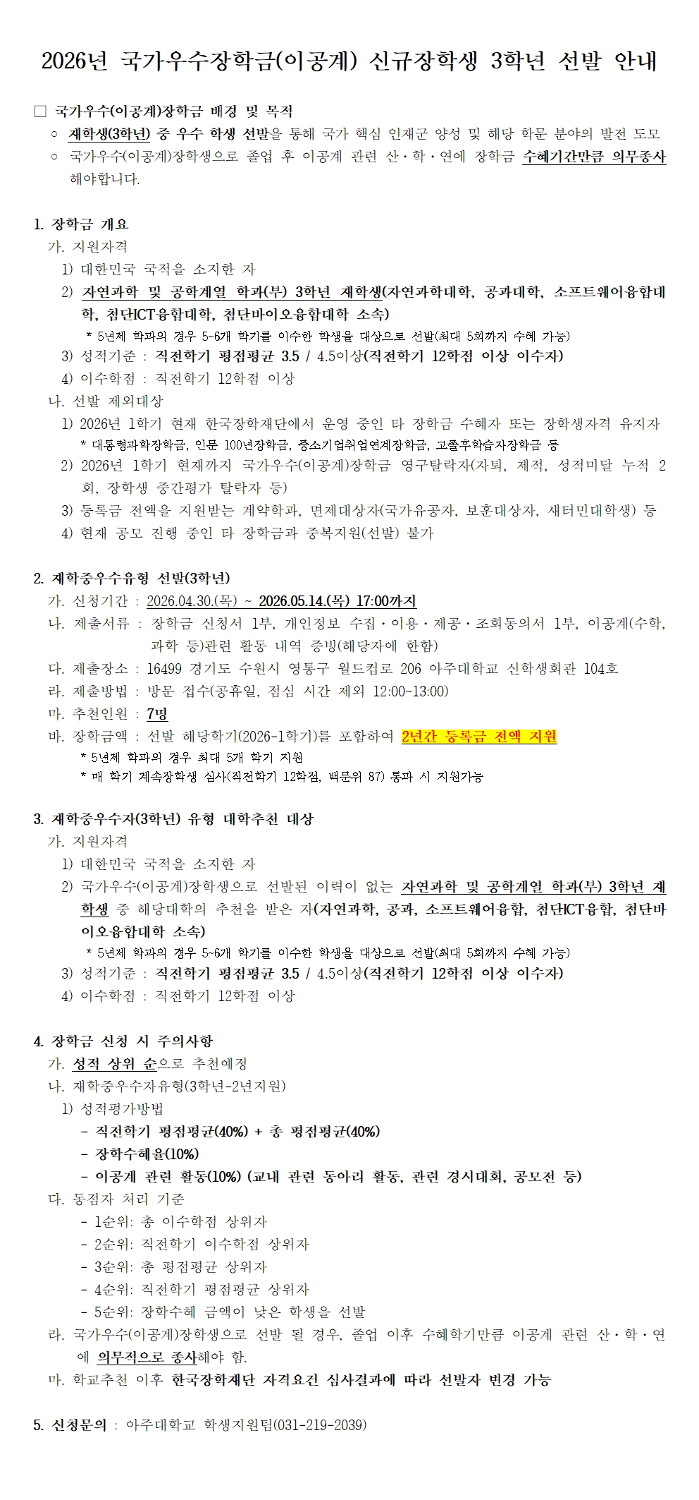 [장학] [한국장학재단] 2026년 1학기 국가우수(이공계)장학금 3학년 신규장학생 신청 안내(~5. 14. 목요일 17:00 까지)