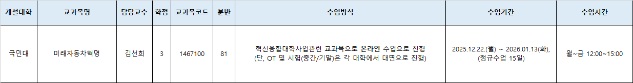 첨단분야 혁신융합대학사업(구디지털신기술인재양성혁신공유대학사업) 미래자동차분야 국민대학교 학점교류안내입니다.