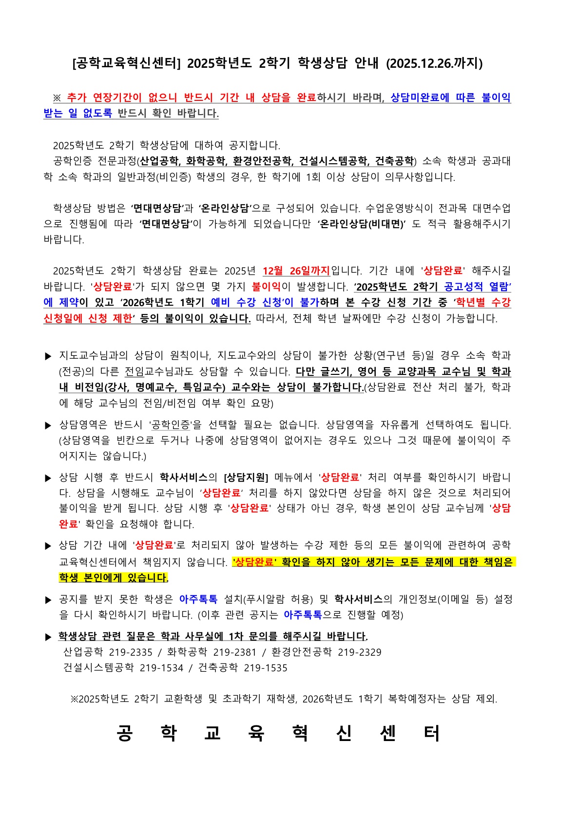 [공학교육혁신센터] 2025학년도 2학기 공학인증 학생상담 안내 (12.26.까지)* 금학기 연장 없음*