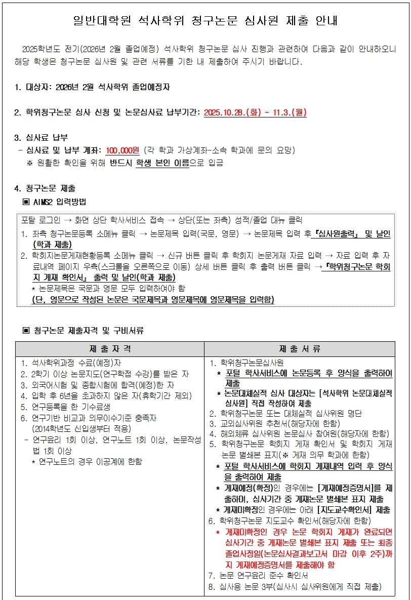 [공지] 2025학년도 전기 석사학위 청구논문 심사원 제출 안내(2026년 2월 졸업예정)