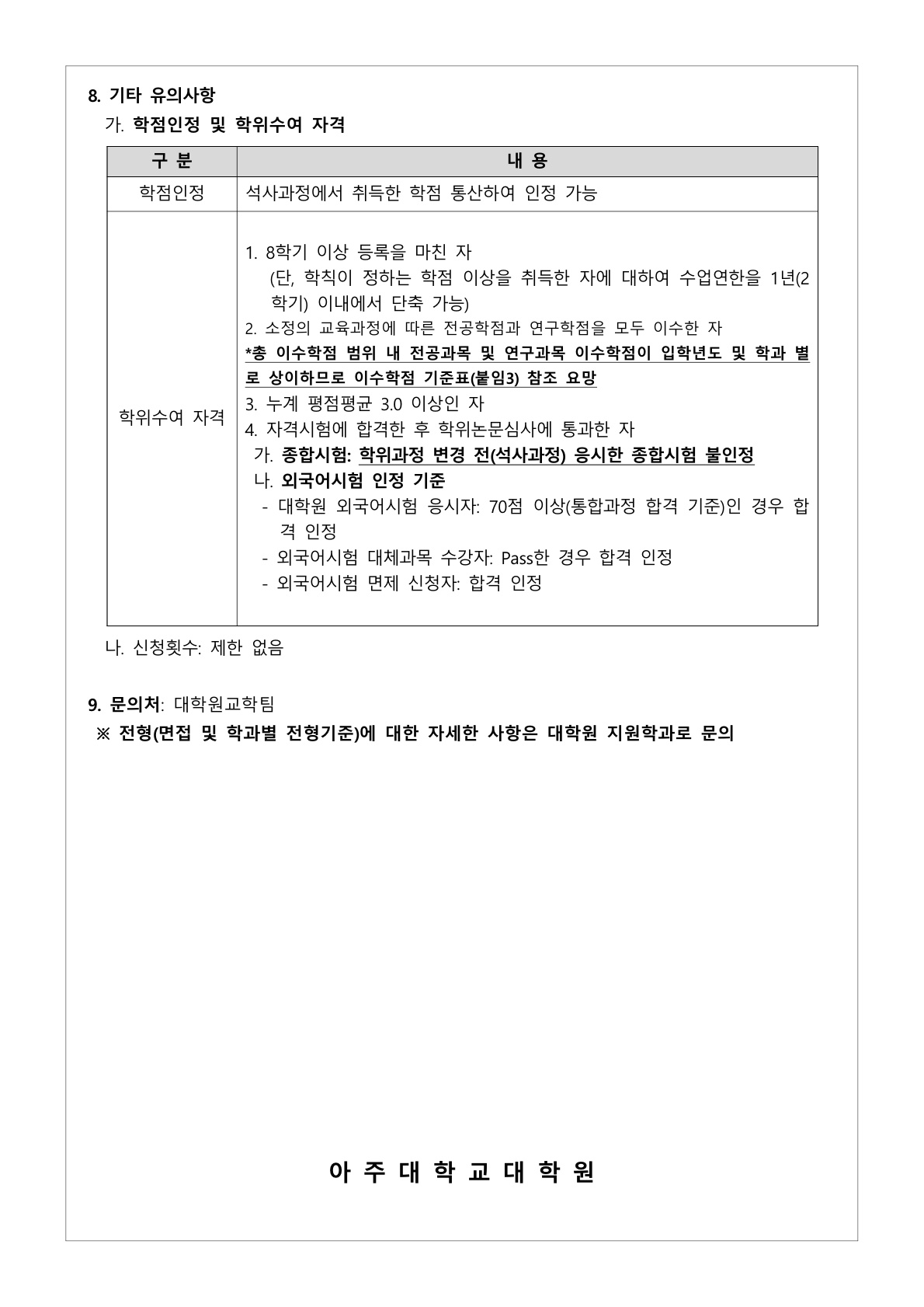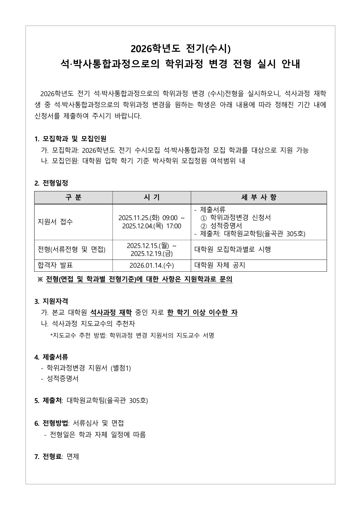 [학사] 2026학년도 전기 석·박사 통합과정으로의 학위과정변경 (수시)전형 실시 안내