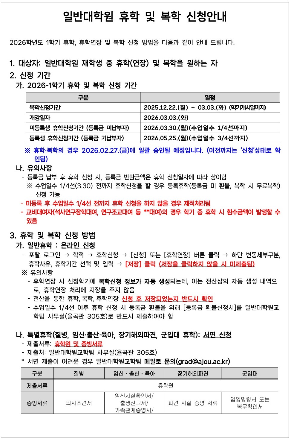 2026학년도 1학기 휴학·복학 및 수료자 등록 유예 신청 안내