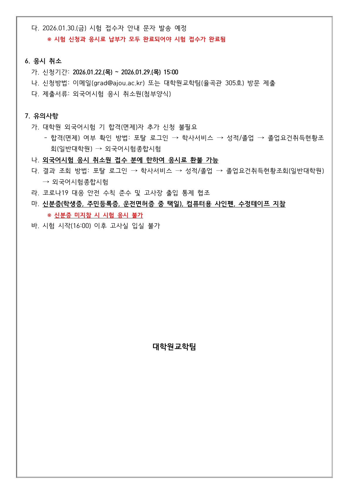 2026학년도 1학기 대학원 외국어(영어) 시험 안내