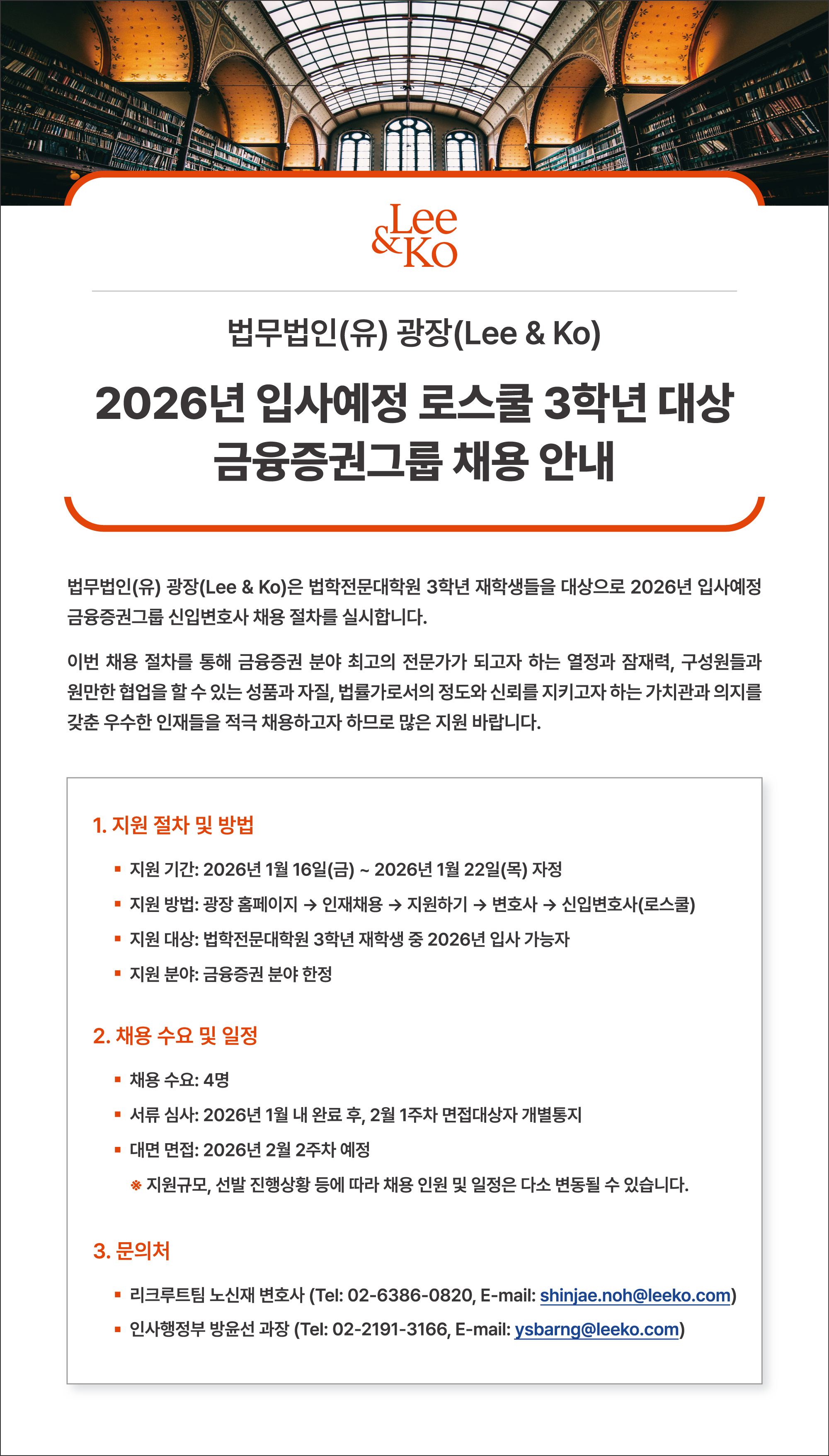 [법무법인(유) 광장] 2026년 입사예정 로스쿨 3학년 대상 금융증권그룹 채용