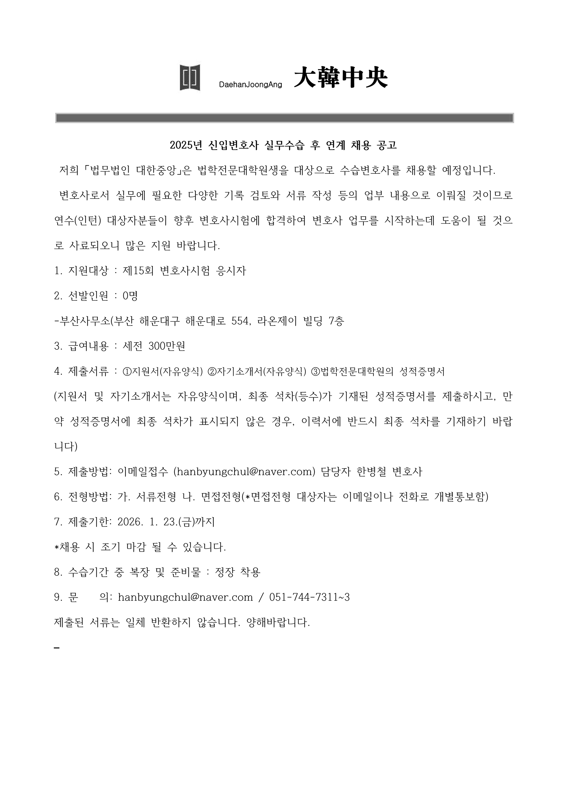 [법무법인 대한중앙] 2025년 신입변호사 수습 후 연계 채용 공고