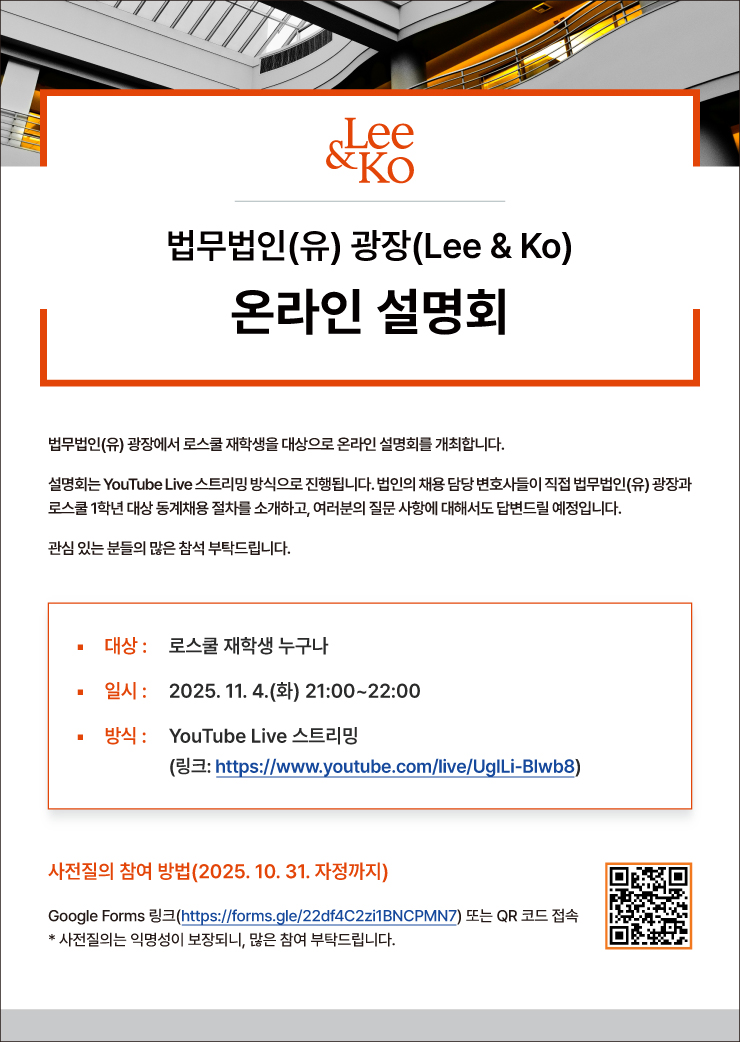 [법무법인(유) 광장] 2025년 로스쿨 재학생 대상 온라인 설명회 안내
