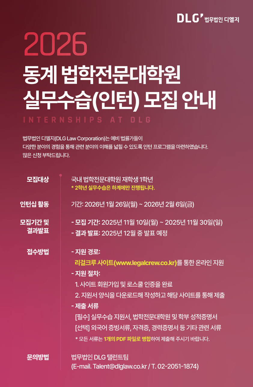 [법무법인 디엘지] 2026년 동계 법학전문대학원 실무수습 모집 안내