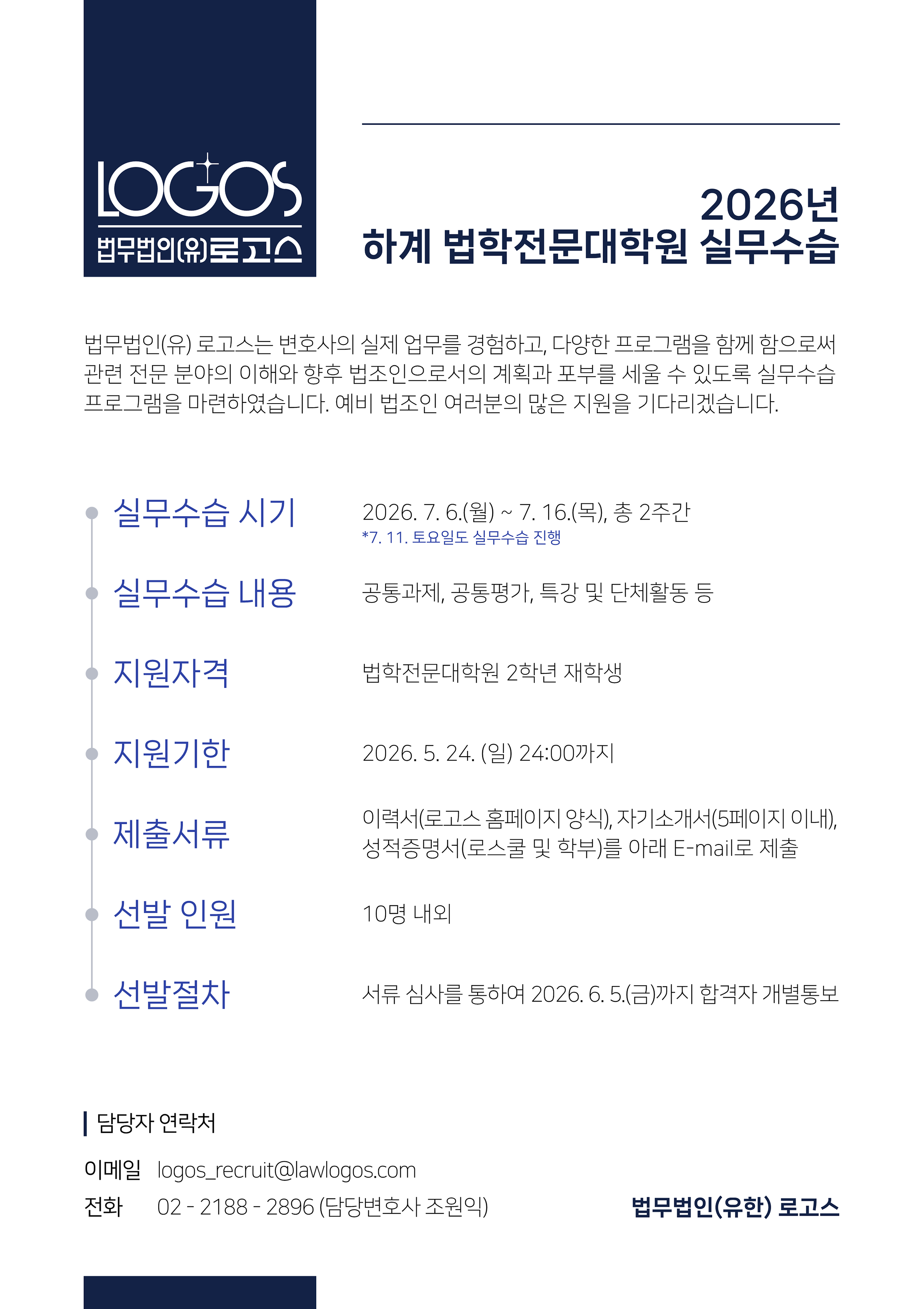 [법무법인(유한)로고스] 2026년 하계 법학전문대학원 실무수습(인턴) 모집