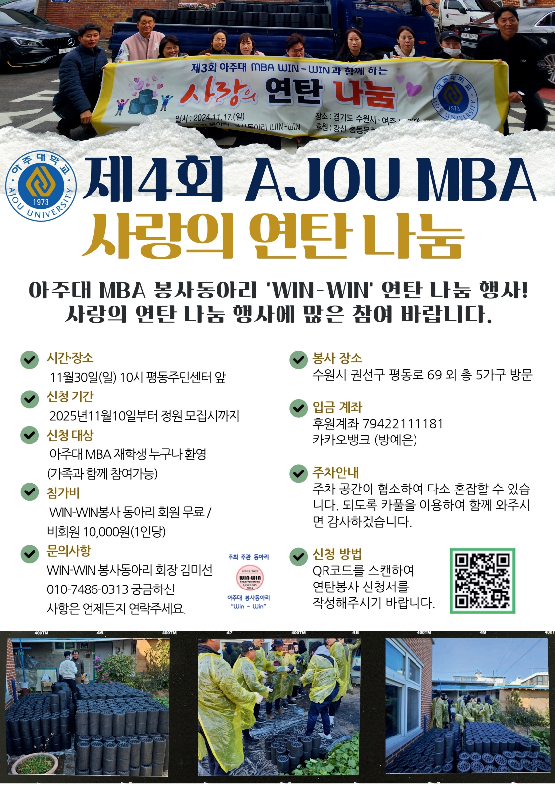 제4회 AJOU MBA 사랑의 연탄 나눔 (봉사동아리 WIN-WIN 연탄 나눔 행사)[ 2025.11.30,일]