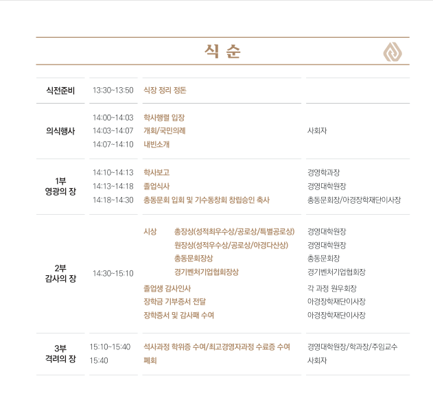2025학년도 전기(2026.2월) 학위수여식이 2026.2.14(토) 오후 2시에 연암관 대강당에서 졸업생, 재학생,  동문 등 300여명이 참석하여 그동안의  인내와 열정이 빛나는 성취로 이어진 뜻깊은 순간을 함께 하였습니다.  이번 학위수여식에는 석사 143명,  최고 20명이 졸업 및 수료를 하였습니다.