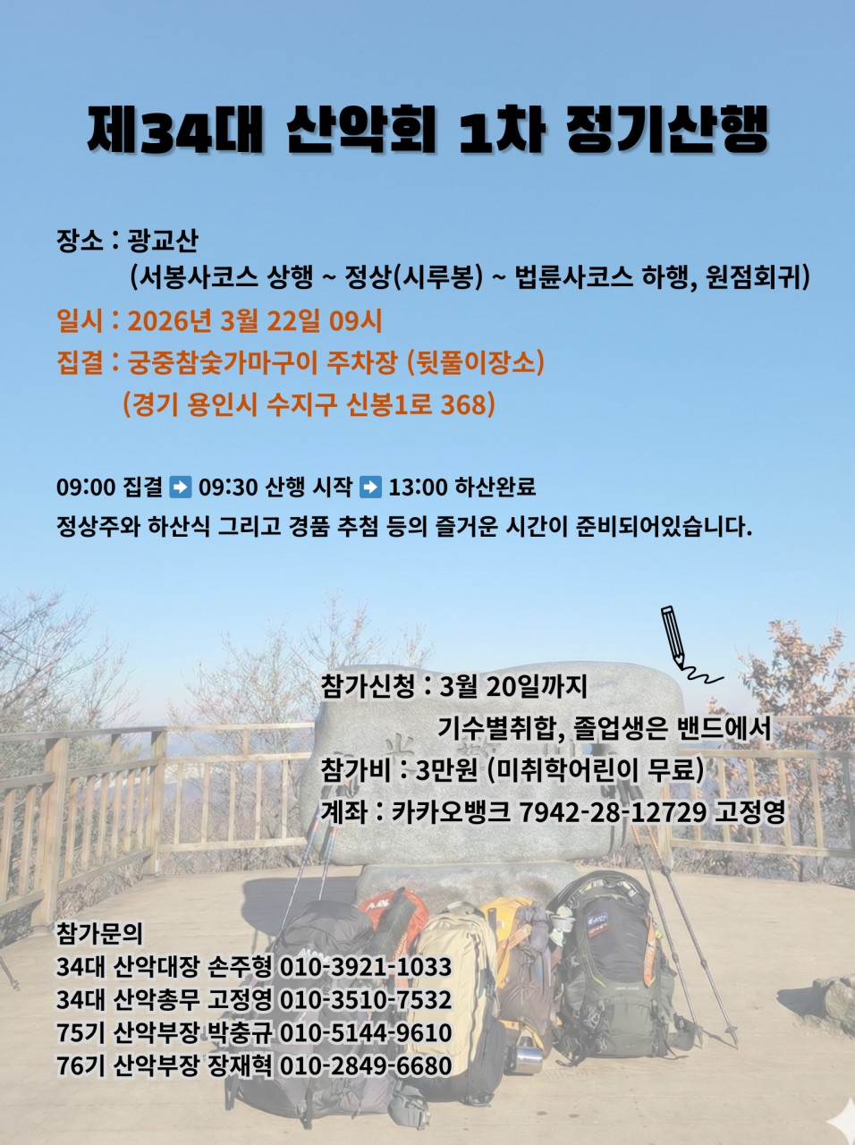 제34대 산악회 2026-1학기 정기(1차) 산행 [광교산, 2026.3.22,일)