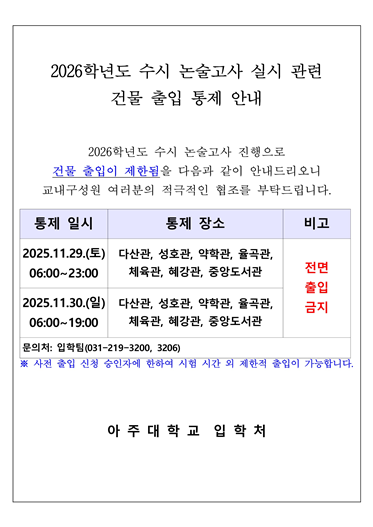 11월 29일(토)-30(일) 양일간 다산관을 포함한 교내(논술고사장 건물)의 출입이 제한(통제)됨을 안내드립니다.