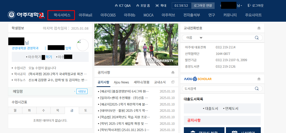 아주대학교 포탈 | https://mportal.ajou.ac.kr | 학적:전공신청/종합시험신청/휴복학신청 교과수업:수업계획서 조회/수강신청 성적/졸업:성적조회/졸업사정표출력 장학/등록:등록금고지서출력/교육비납입증명서출력 아주Bb:온라인 수업 학습 및 오프라인수업 과제등 기타:교내 전화번호 및 이메일 검색/증명서 발급 |