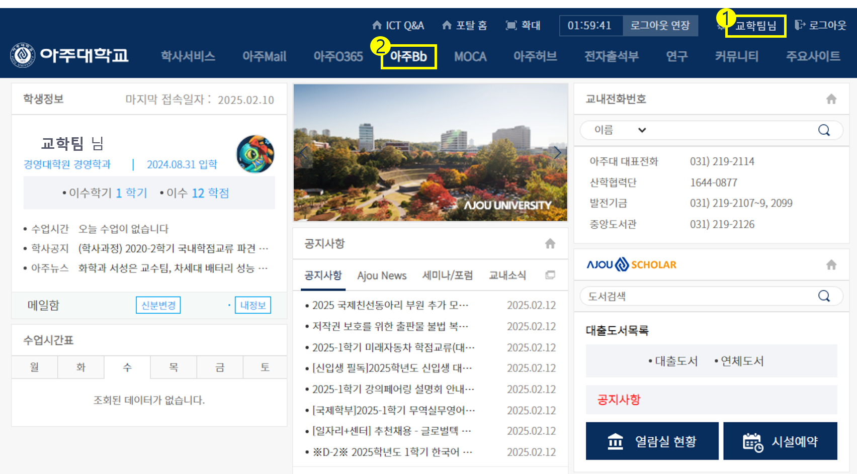 9) 홈페이지가 두개가 운영되며, 하나는 아주대학교 포탈, 하나는 아주대학교 경영대학원 홈페이지입니다.