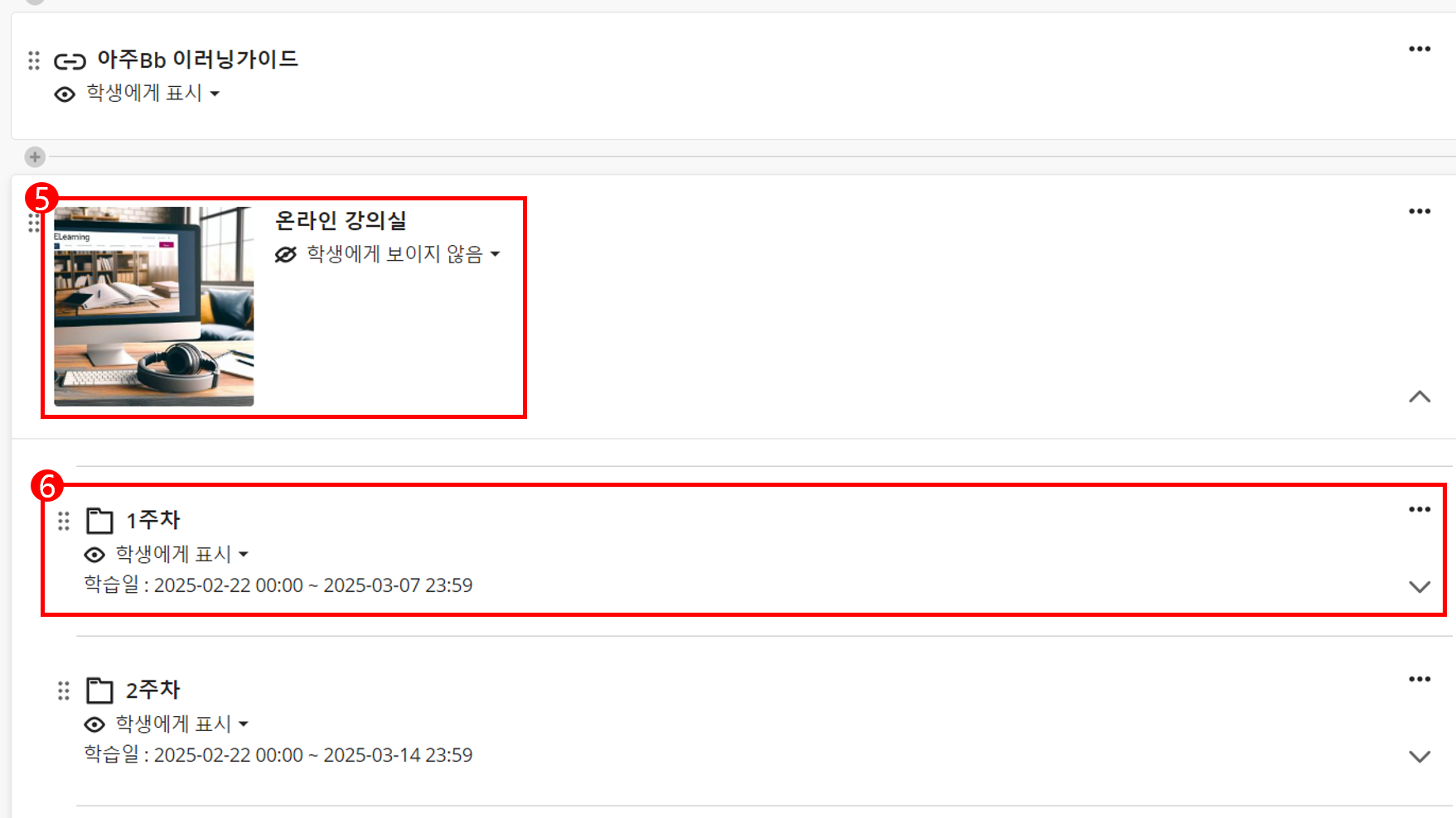 - 출석은 표기된 학습일 기간내에 수강 완료 되어야 출석인정됩니다. 해당 학습일 기간이 아닌 경우 수강은 가능하나 출석으로 인정되지 않습니다. (아주Bb 온라인 강의실에서 주차별 학습일 참고)