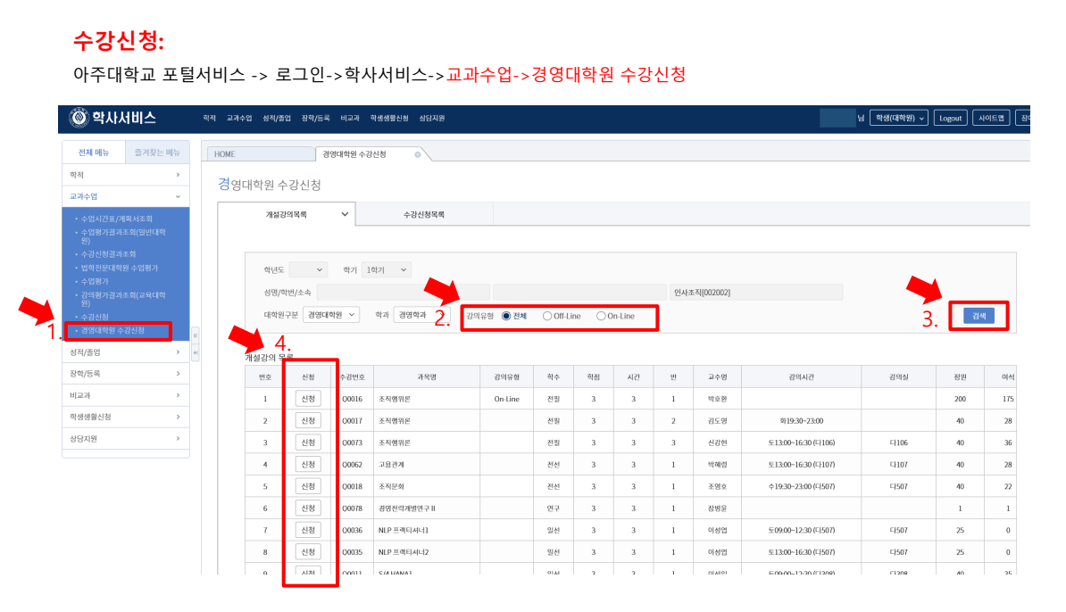 2) 본인의 전공과 상관없이 최고경영자과정의 수업을 제외한 모든 전공과목 수강신청 가능합니다.