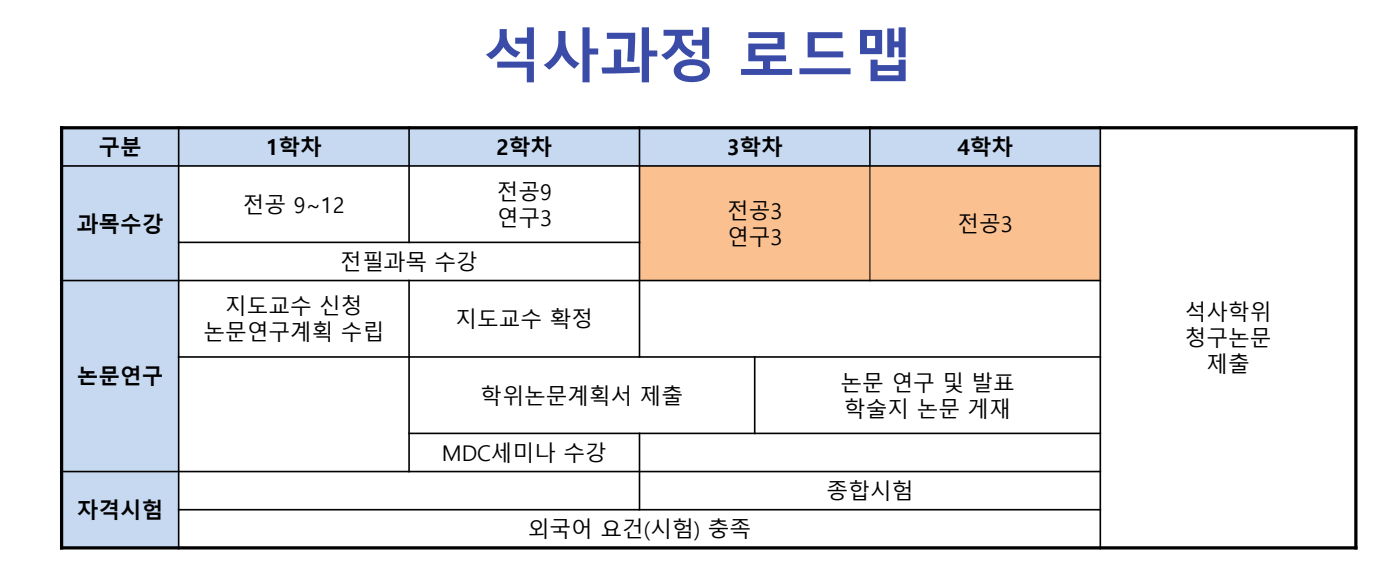 | 4학기 | • 전공 3학점 + 연구 3학점 수강신청(이미 연구6학점을 수강한 경우에는 선택사항) • 외국어시험 통과 완료 또는 면제 서류 신청 • 종합시험 통과 완료 • 학위청구 논문 심사 제출 및 통과 |