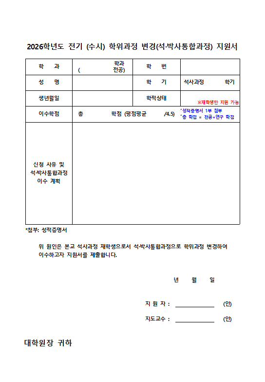 2026학년도 전기 석·박사통합과정으로의 학위과정 변경 정시 전형을 실시하오니, 석사과정 재학 생 중 석·박사통합과정으로의 학위과정 변경을 원하는 학생은 아래 내용에 따라 정해진 기간 내에 신청서를 제출하여 주시기 바랍니다.