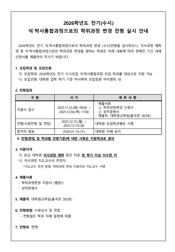 붙임 1. 2026 전기(수시) 석박사통합 학위과정변경 모집전형 안내문 1부.
